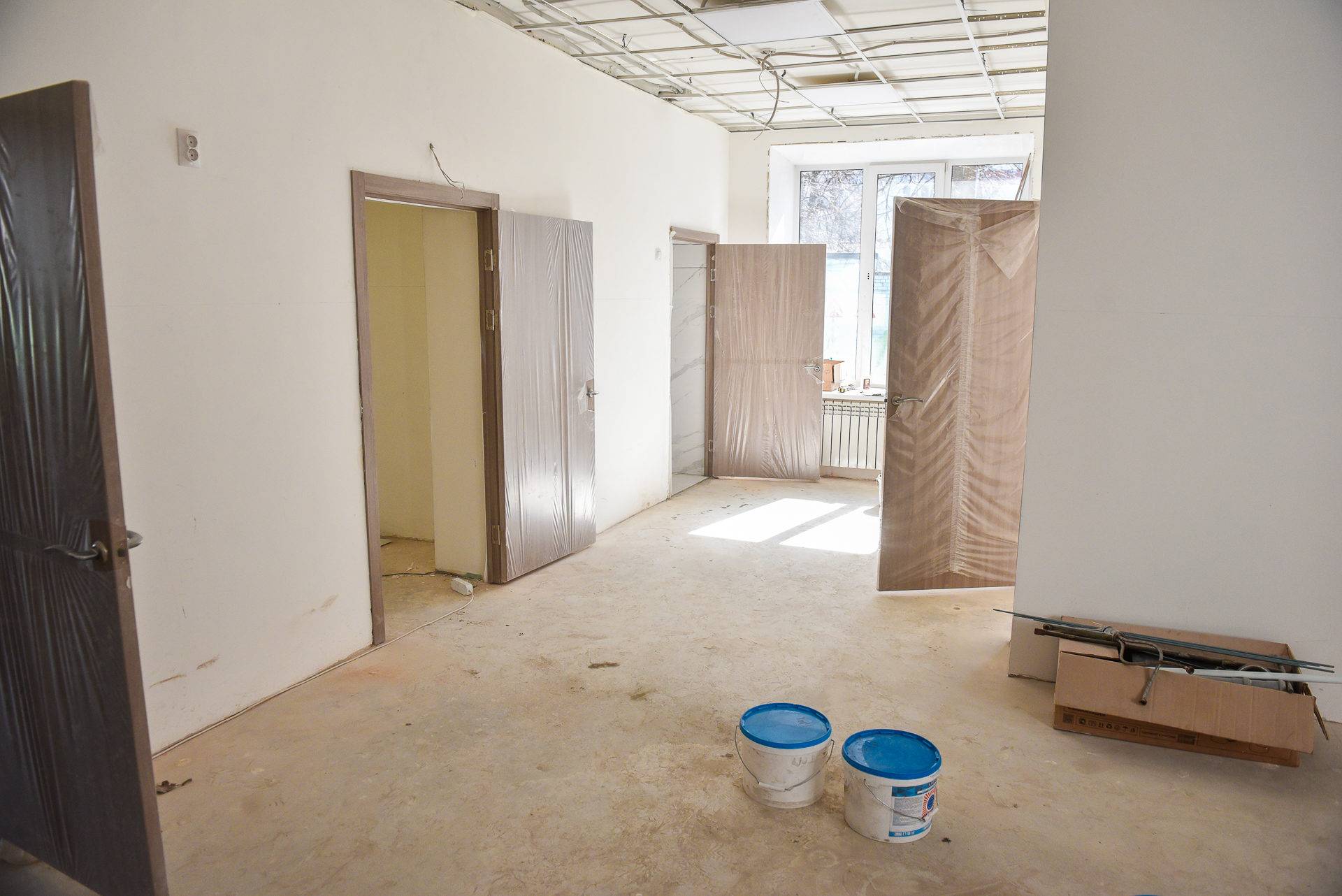 Работы ведутся с опережением, на данный момент процесс выполнения составляет 44%. На очереди покраска стен, обновление потолка и линолеума. Уже установлены новые двери, частично завершен ремонт в санузлах и душевых кабинах.