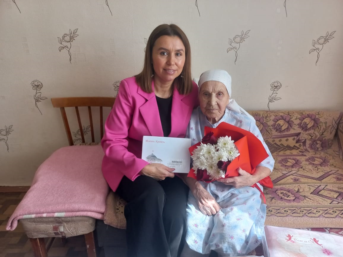 В Комсомольском районе 95-летний юбилей со дня рождения отмечает ветеран Великой Отечественной войны Хамидулина Мияссара Ахматгареевна. Поздравления и подарки от имени Президента РФ Владимира Путина, мэра г. Набережные Челны Наиля Магдеева и от себя лично юбиляру вручила заместитель Главы администрации Комсомольского района Эльвира Валиева.