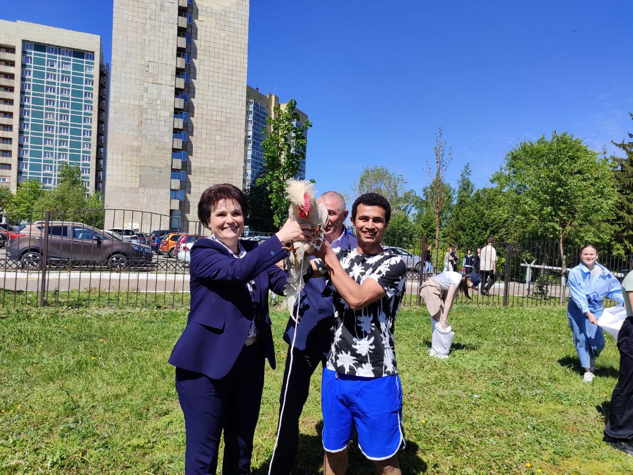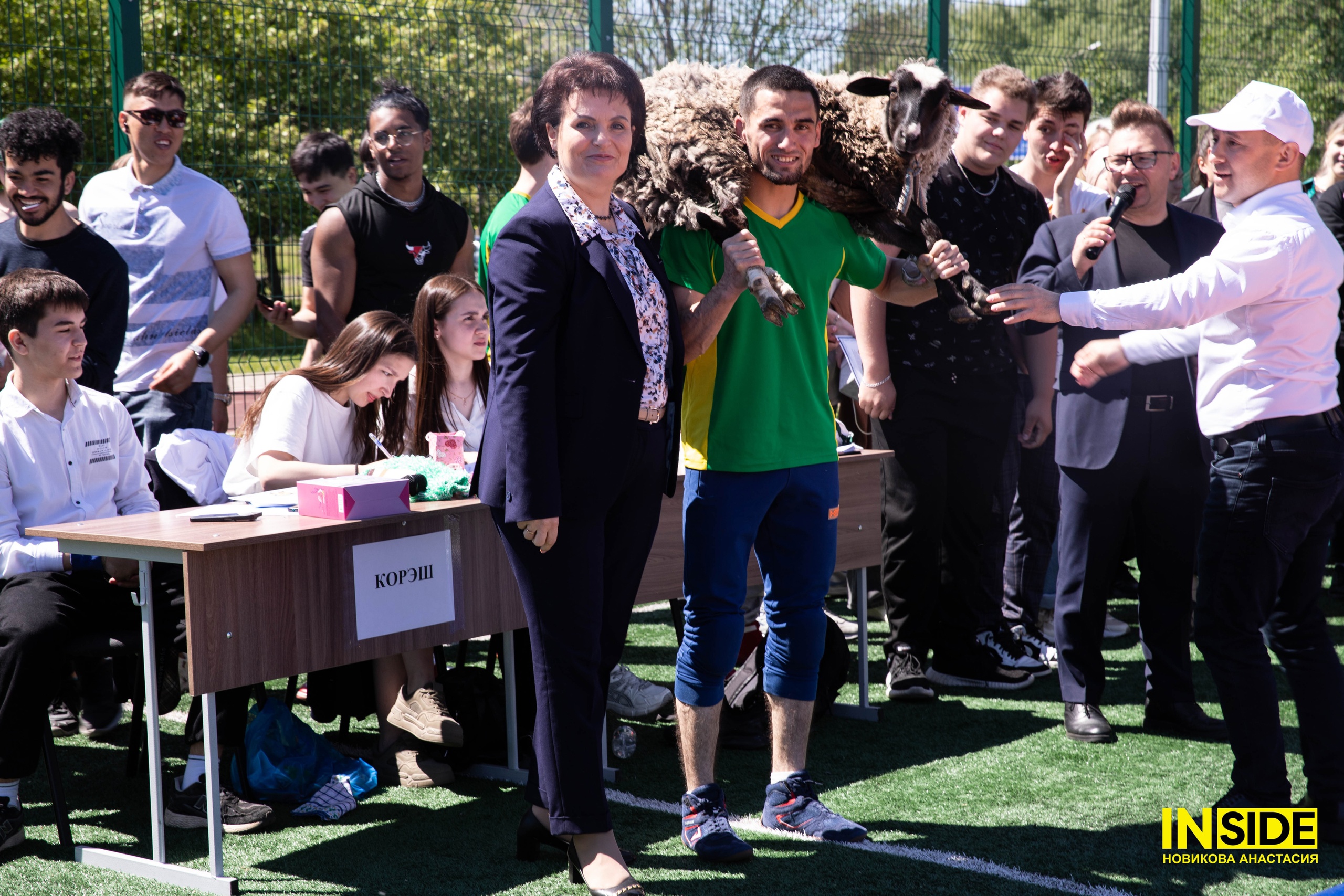 Главные атрибуты праздника – петух и баран. Петуха получил победитель состязания «Бег в мешках» иностранный слушатель из Египта – Мохаммед Ахмад. Баран по традиции достался абсолютному батыру Сабантуя. В этом году им стал студент факультета физической культуры и спорта Вепа Гурбанов.