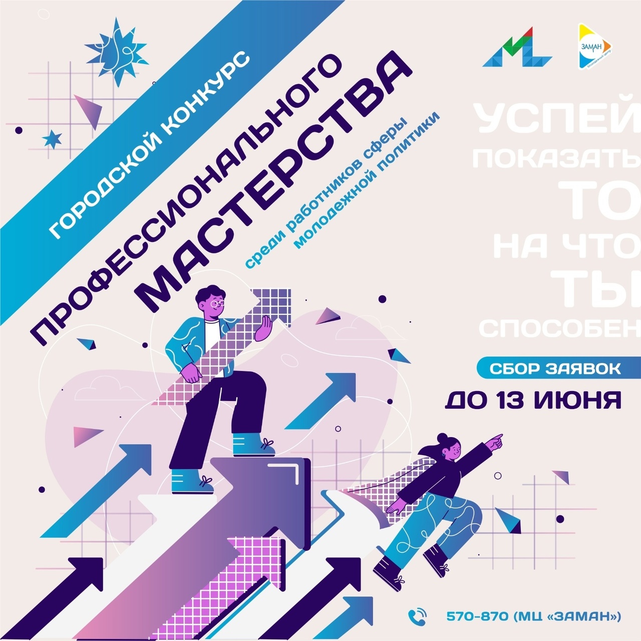 Конкурс пройдёт в три этапа. Заявки на участие принимаются до 13 июня в молодёжного центра «Заман» по адресу: Цветочный бульвар, 1А (20/07А), каб. 19. Телефон для справок – 570-870.