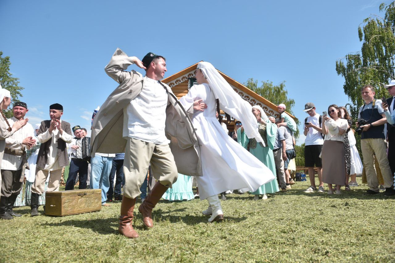 Возле татарской избы гостям показали импровизированную сценку «Килен төшерү»с участием артистов Набережночелнинского государственного татарского драматического театра имени Аяза Гилязова и городского культурного центра «Эврика».