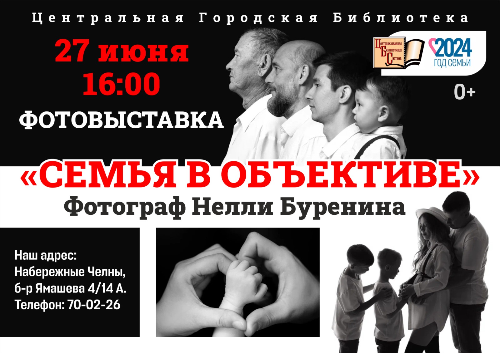 Отдел искусств центральной городской библиотеки приглашает челнинцев и гостей города на фотовыставку семейного фотографа Нелли Бурениной, которая представит свою выставку чёрно-белых фотографий, посвященную Году семьи.