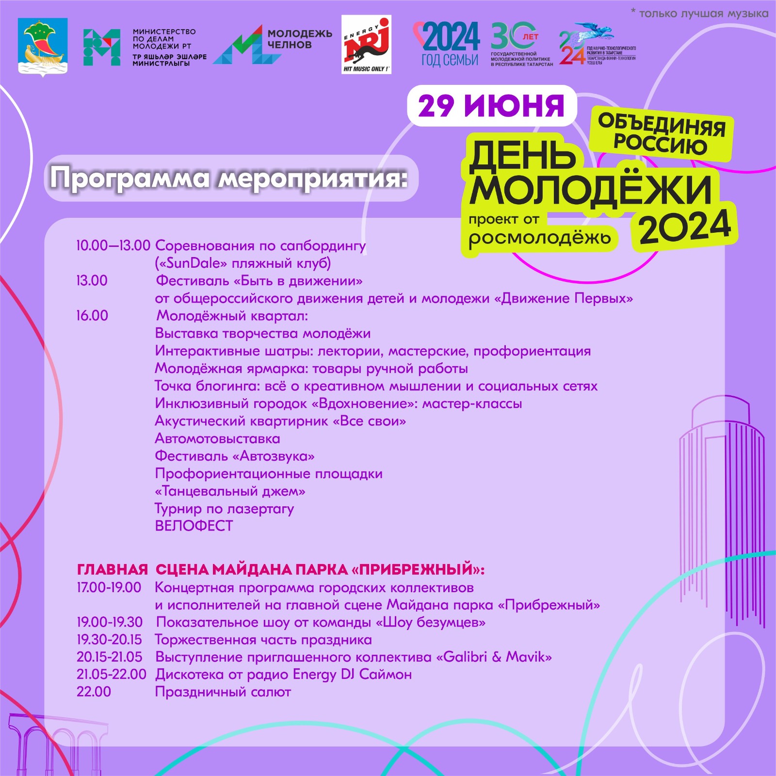 29 июня в Набережных Челнах отпразднуют День молодежи. Праздник пройдет от проспекта Чулман по проспекту Х.Туфана до майдана парка Прибрежный.