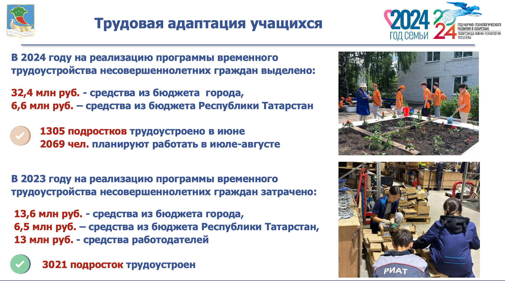 В текущем году на реализацию программы временного трудоустройства несовершеннолетних граждан из бюджета города выделено средств более чем в два раза в сравнении с прошлым годом – 32,4 млн рублей, из бюджета республики – 6,6 млн руб. Для сравнения в 2023 году сумма затраченных средств из городского бюджета составила 13,6 млн рублей, из бюджета РТ – 6,5 млн руб., средства работодателей – 13 млн рублей.