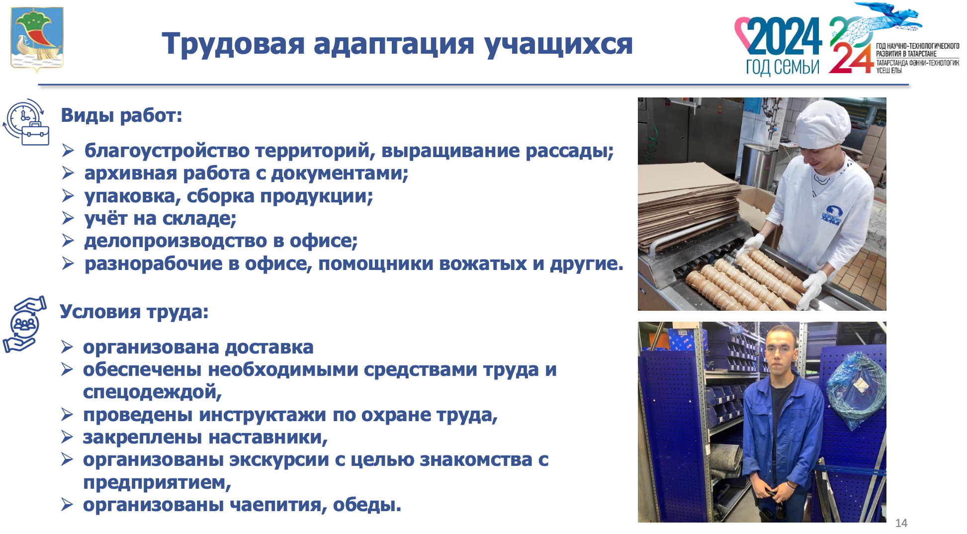 С целью исключения нарушений условий труда и норм трудового распорядка, специалисты Кадрового центра осуществляют контроль за созданием условий труда, направленных на сохранение жизни и здоровья подростков. Всего организовано 10 проверок, нарушений не выявлено. На всех проверенных предприятиях созданы благоприятные условия труда, организована доставка либо предусмотрена компенсация проезда. Дети обеспечены необходимыми средствами труда и спецодеждой, проведены инструктажи по охране труда, закреплены наставники, организованы экскурсии с целью знакомства с предприятием, чаепития, обеды.