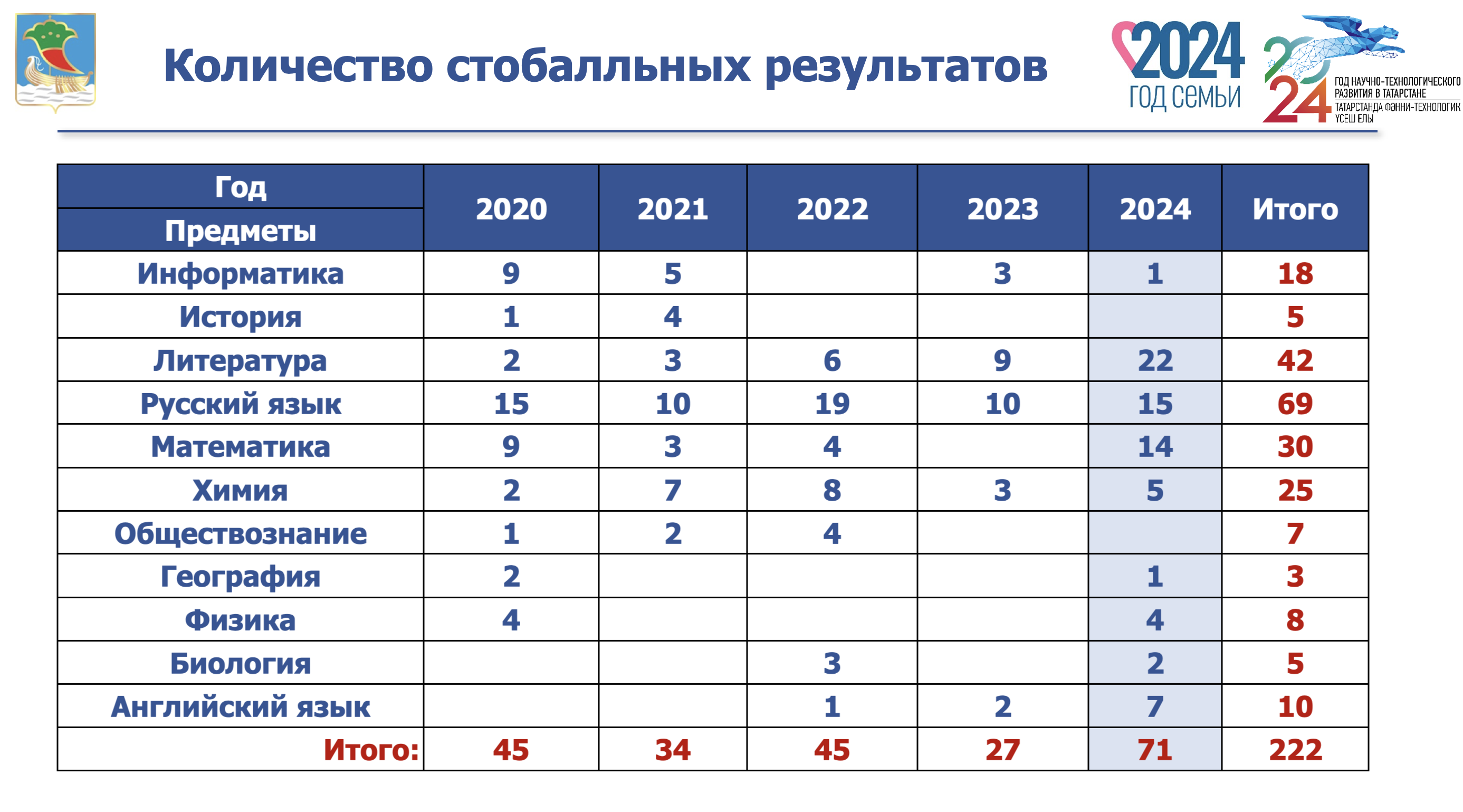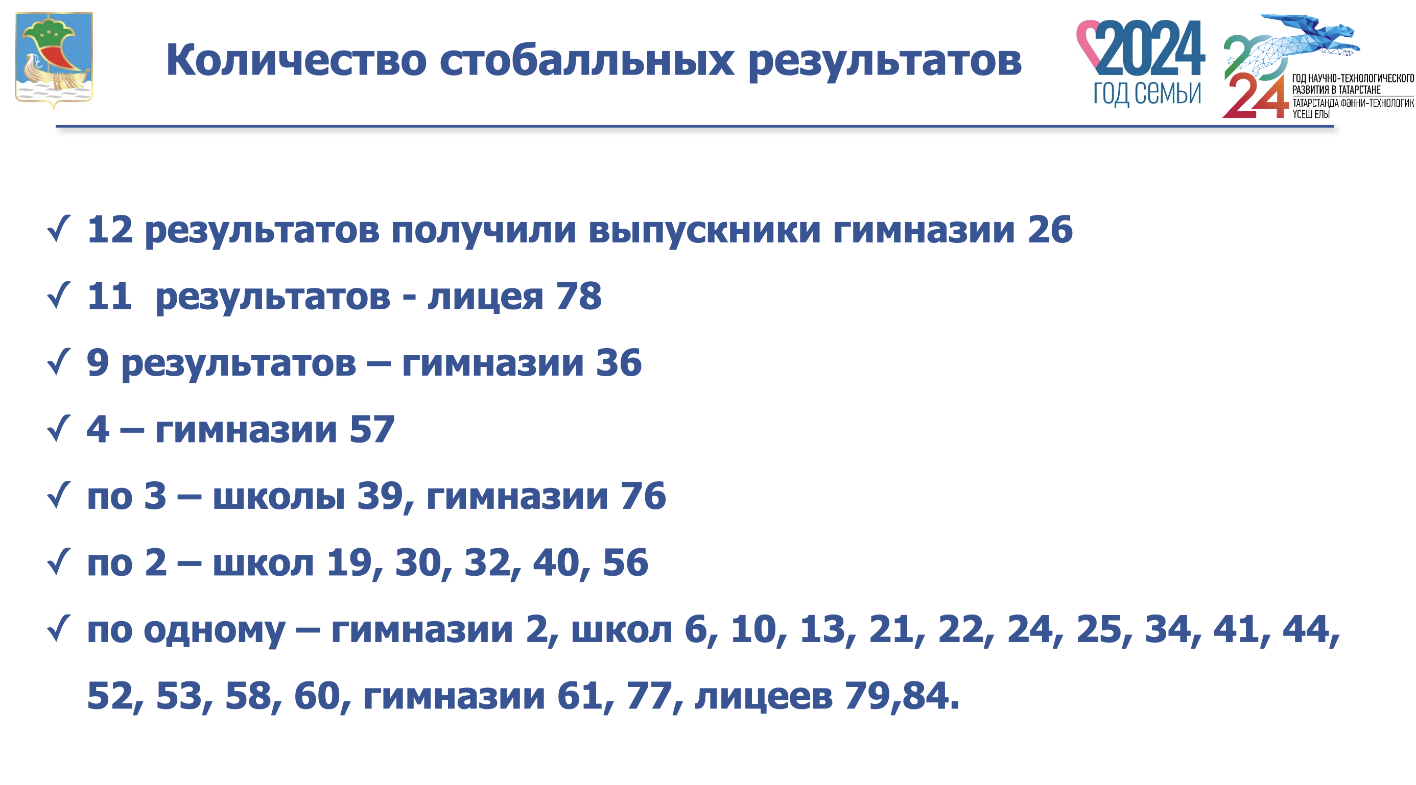 Получено 71 стобалльных результатов: русский язык – 15, математика – 14, химия – 5, литература –22, КЕГЭ – 1, английский – 6, география – 1, физика – 4, биология – 2. Три выпускника получили стобалльные результаты по двум предметам: Ильяс Аетдинов, выпускник гимназии №26, получил по 100 баллов на ЕГЭ по математике и информатике, Диана Бакирова, выпускница средней школы №56, по русскому и английскому языкам и Егор Серединский, выпускник гимназии №26, по математике и английскому языку.