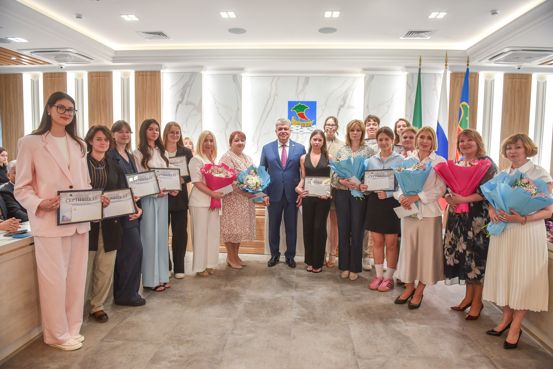 Я родилась в этом городе, окончила школу и обязательно вернусь и буду работать на благо моего города. Мы гордимся любимым городом!" – обратилась выпускница школы №10, обладательница 100-балльного результата по литературе Полина Власова.