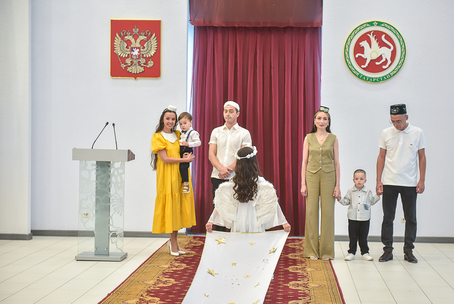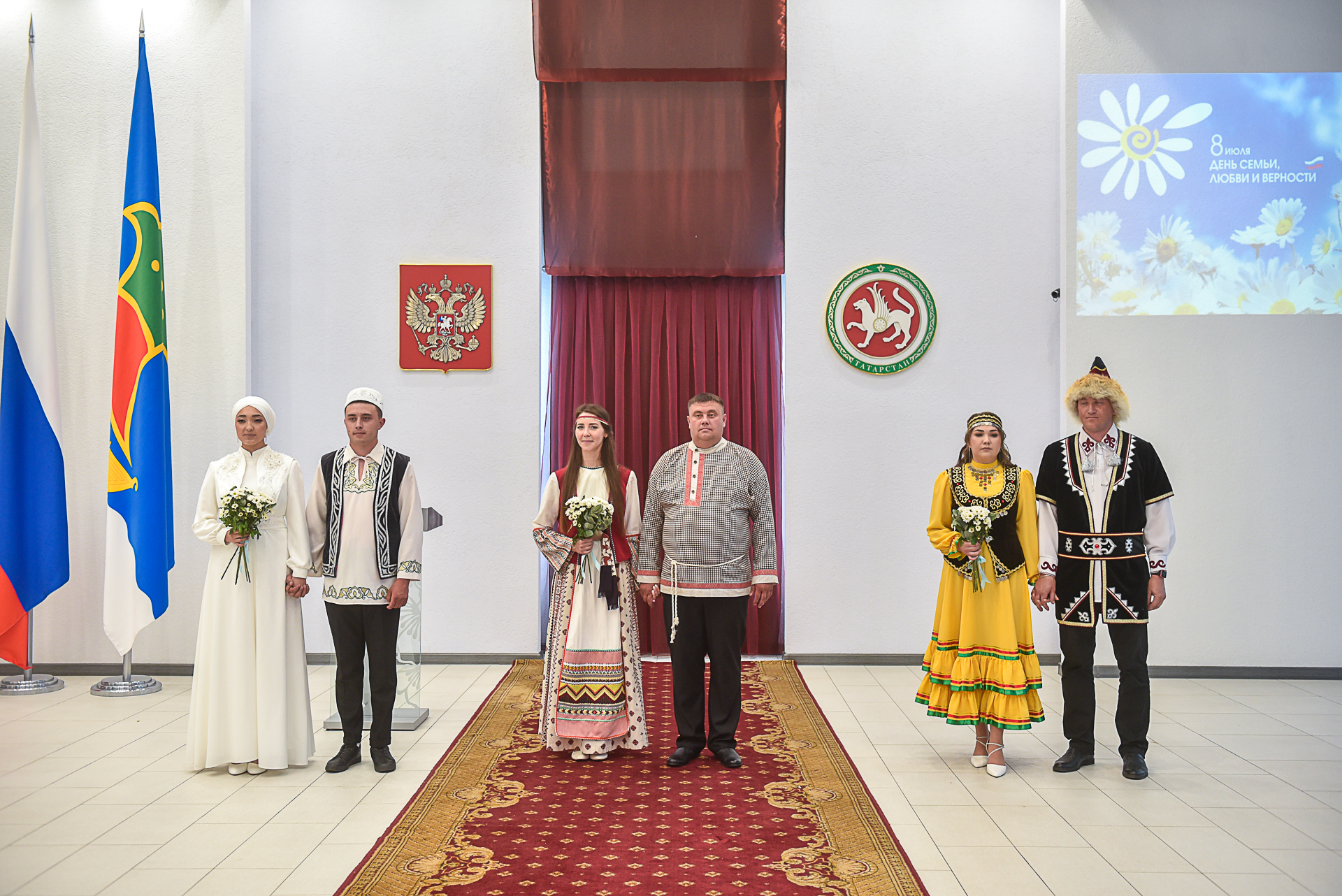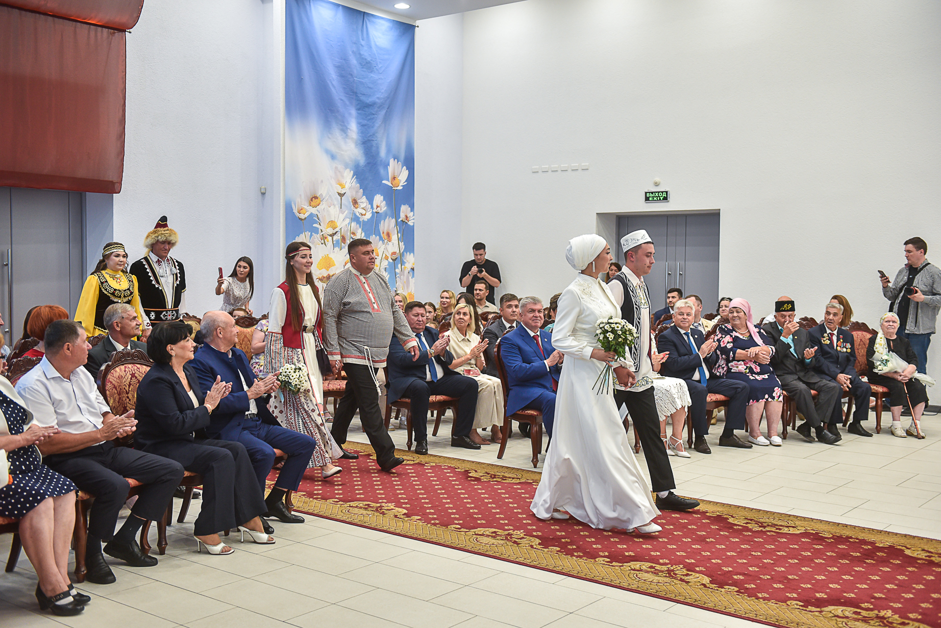 Под марш Мендельсона в зал торжеств вошли сразу три пары в национальных костюмах, которые зарегистрировали семейный союз: Ранис Багаутдинов и Язиля Рахимова, Константин Родионов и Ирина Блинова, Вадим Миргалиев и Айсылу Баянова.