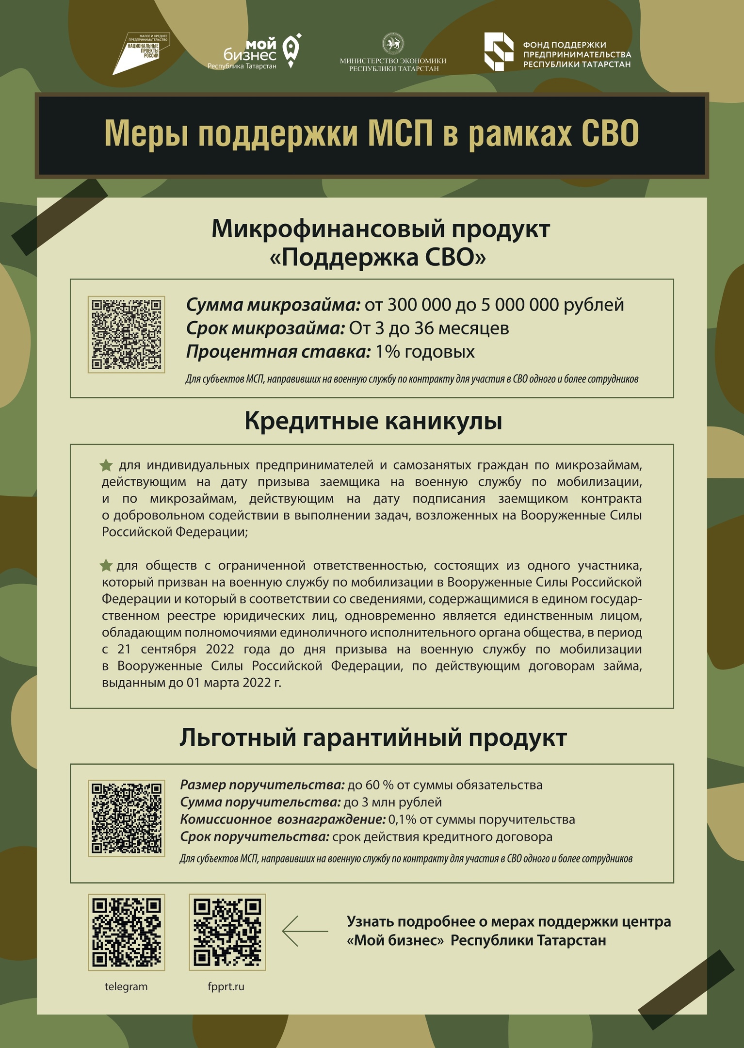 С более подробной информацией о действующих мерах поддержки и сроках приема заявок можно ознакомиться по телефону горячей линии 8 (843) 524-90-90 и на сайте Министерства экономики Республики Татарстан https://mert.tatarstan.ru/predprinimatelstvo.htm, сайте Фонда поддержки предпринимательства Республики Татарстан https://fpprt.ru/.