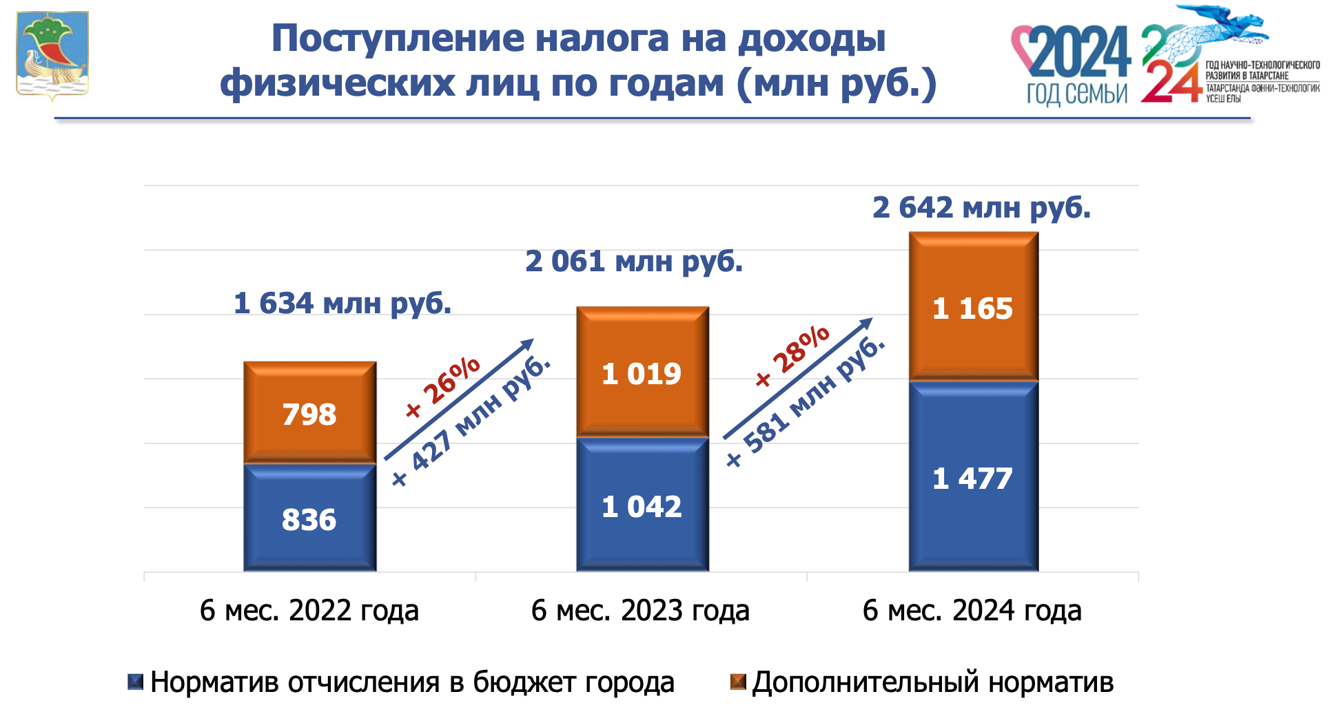 За 6 месяцев 2024 года доход в бюджет города получен в сумме 10 млрд 657 млн рублей, в том числе за счет собственных доходов – 4 млрд 181 млн рублей и межбюджетных трансфертов – 6 млрд 476 млн рублей. Об этом сегодня в ходе аппаратного совещания с мэром Наилем Магдеевым доложила заместителя Руководителя Исполнительного комитета, начальник управления финансов Светлана Мулюкова.