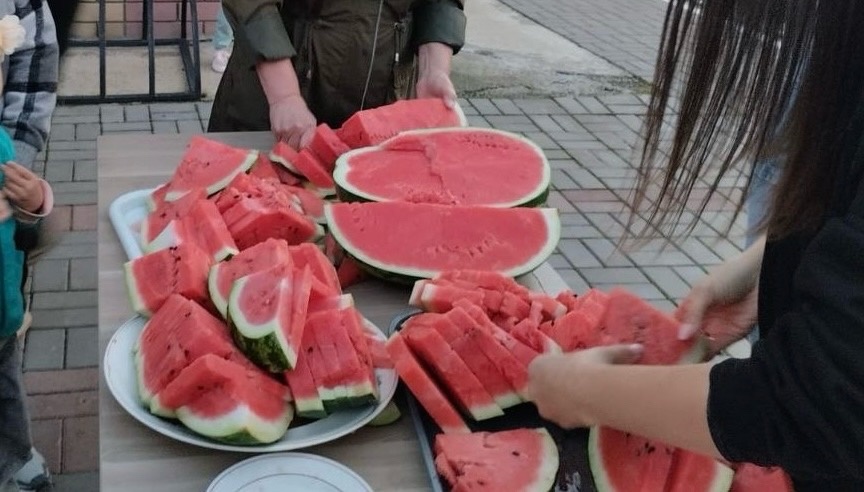 Участники соревновались в поедании арбуза и в других развлекательных конкурсах. Весь вечер жителей и гостей поселка угощали лакомствами.