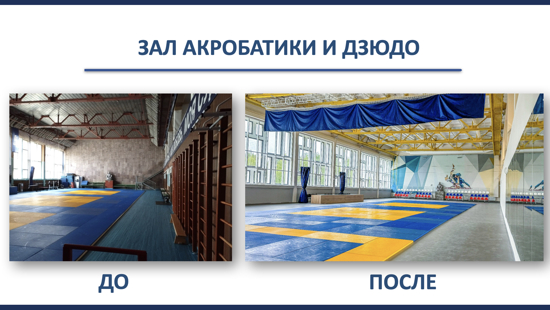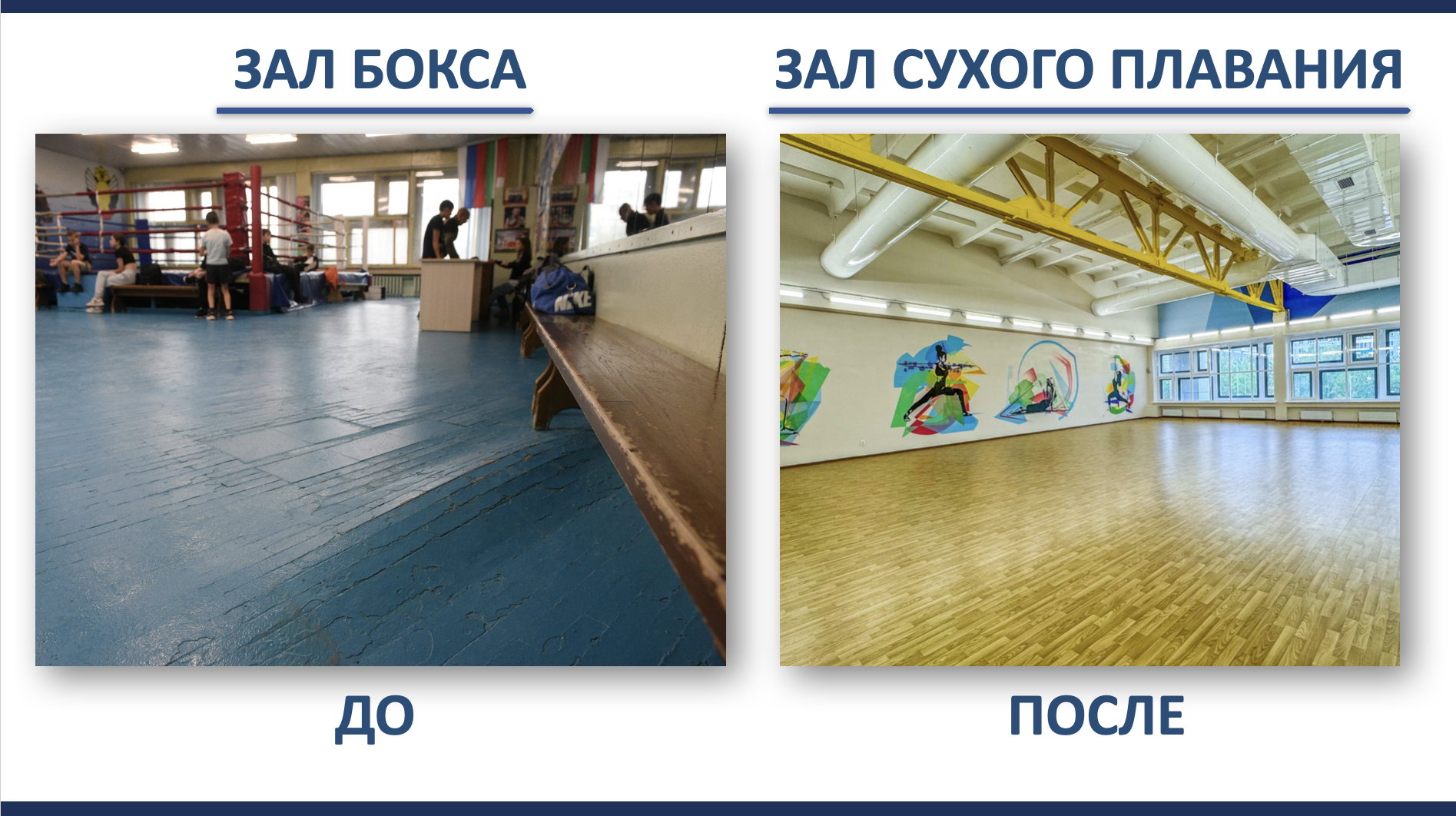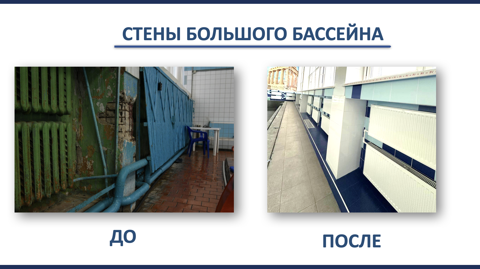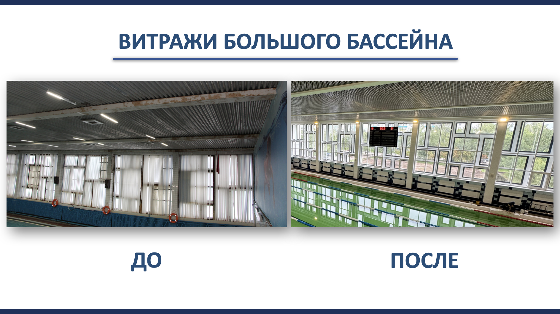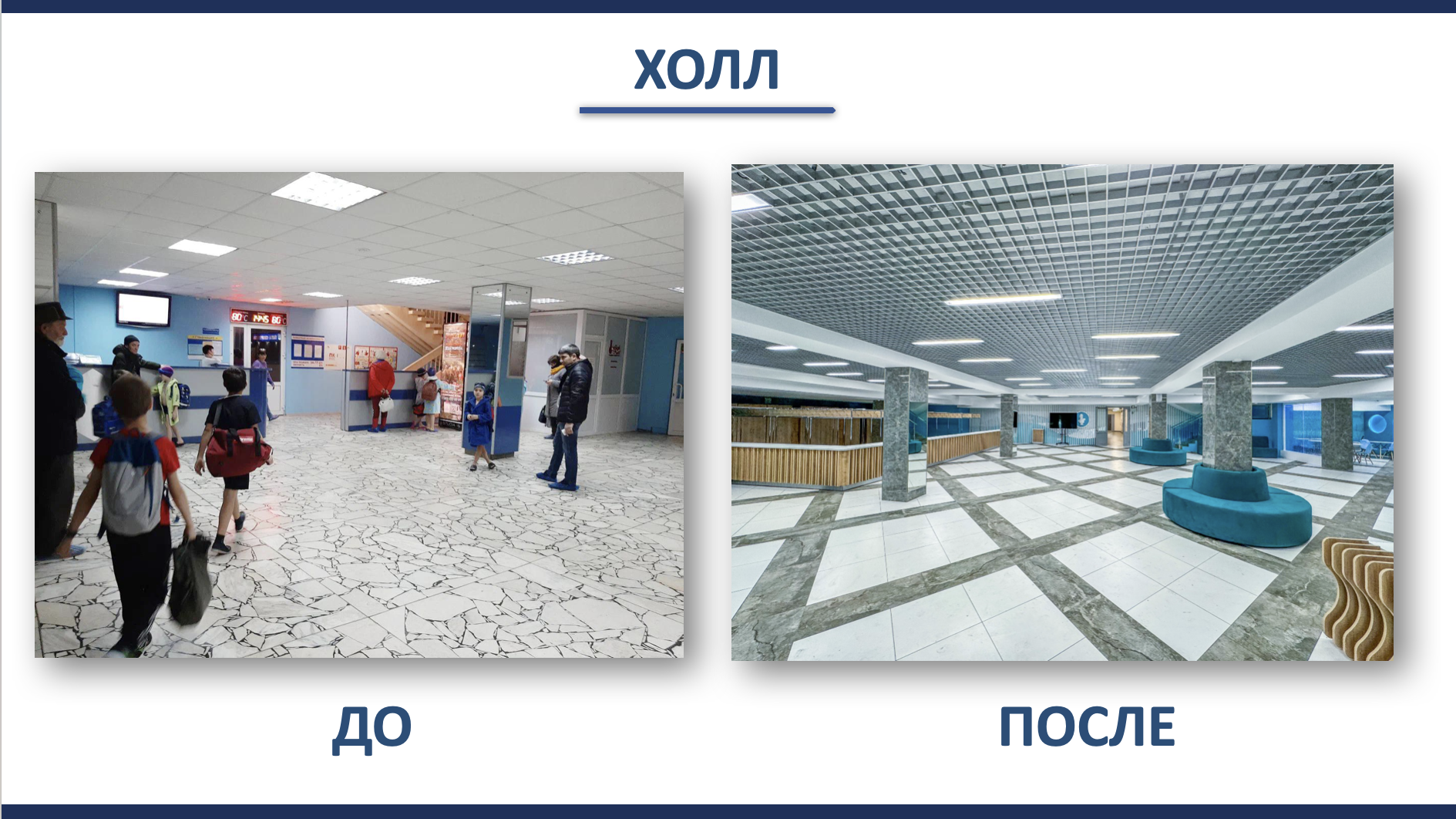 Управление информационной политики и по связям с общественностью представляет фотографии в формате "до после". Прежде всего строители компании "Твой Дом" изменили и утеплили фасад. Принято решение и об увеличении гардероба. Стала комфортней зона ожидания, появилось кафе.Для боксеров зал расположен на втором этаже, его площадь составляет – 241,0 кв.м.Менялось устройство теплых полов и система водоподготовки для бассейна.В «Олимпийском» сохранились исторические, узнаваемые и любимые горожанами архитектурные решения, задуманные и воплощенные при строительстве здания.Раздевалка стала просторнее, полностью обновлена душевая зона.Бассейны обрели спуски для детей с ограниченными физическими возможностями. В детском бассейне обыграна морская тематика, где на потолке появились морские рыбки в 3D формате.Обновленная зона сауны. Коридор второго этажа, с балкона которого полностью виден зал акробатики и дзюдо.Обновленный спортивный зал, разделенный на две тренировочные зоны – для акробатики и дзюдо.Лестничная зона обрела морскую тематику, где рядом расположен настенный фонтан. Стены украшают бюсты греческих богов Олимпа в объемном пиксельном формате.