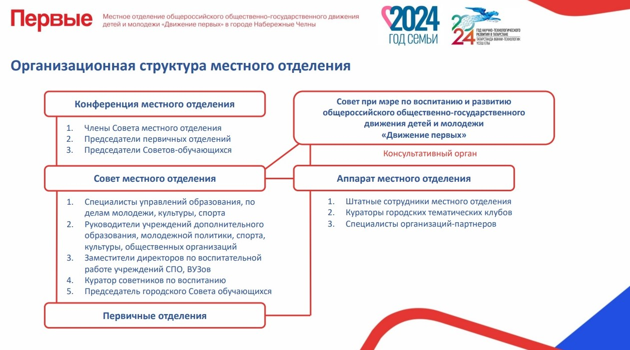 В 2023-2024гг. местное отделение «Движения Первых» вело работу по трем основным направлениям: строительство организационной инфраструктуры, информирование детей, молодежи, педагогов и родительского сообщества о миссии, ценностях и возможностях организации, а также запуск реализации мероприятий и проектов «Движения первых» в Набережных Челнах.