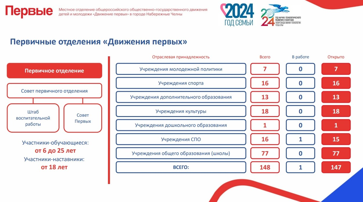 Опорная структурная единица «Движения Первых» – первичные отделения. "С сентября 2023 года по август 2024 года в Набережных Челнах начали свою работу 147 первичных отделений «Движения Первых» на базе школ, колледжей, учреждений дополнительного образования, молодежной политики, культуры и спорта. На II Съезде «Движения Первых» в феврале 2024 года принято решение об изменении возрастных границ участников-обучающихся: теперь это дети и молодежь в возрасте от 6 до 25 лет. В данный момент ведется подготовительная работа для открытия первичных отделений в вузах города. Также в рамках соглашения о сотрудничестве между «Движением Первых» и Министерством труда, занятости и социальной защиты Республики Татарстан запущен процесс открытия первичного отделения движения на базе социального приюта для детей и подростков «Асылташ», – сказал Константин Мамаков.