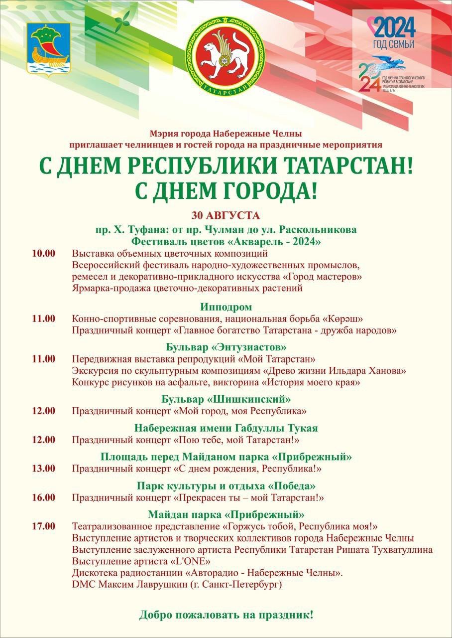 30 августа в Набережных Челнах празднуется День Республики Татарстан и День города. В ходе аппаратного совещания заместитель руководителя Исполнительного комитета Винер Харисов отметил, что в этом году событие будет отмечаться в 34 раз.Праздничные мероприятия накануне Дня Республики Татарстан начнутся уже 27 августа. Завтра в Казани пройдет прием Раиса Республики Татарстан Рустама Нургалиевича Минниханова и его супруги в рамках чествования лучших семей республики. Город Набережные Челны представит семья АнтоновыхАлексей Валерьевич – ветеран специальной военной операции и Анастасия Владимировна. К празднику все семьи участников СВО получат подарки от имени мэра города Наиля Магдеева.