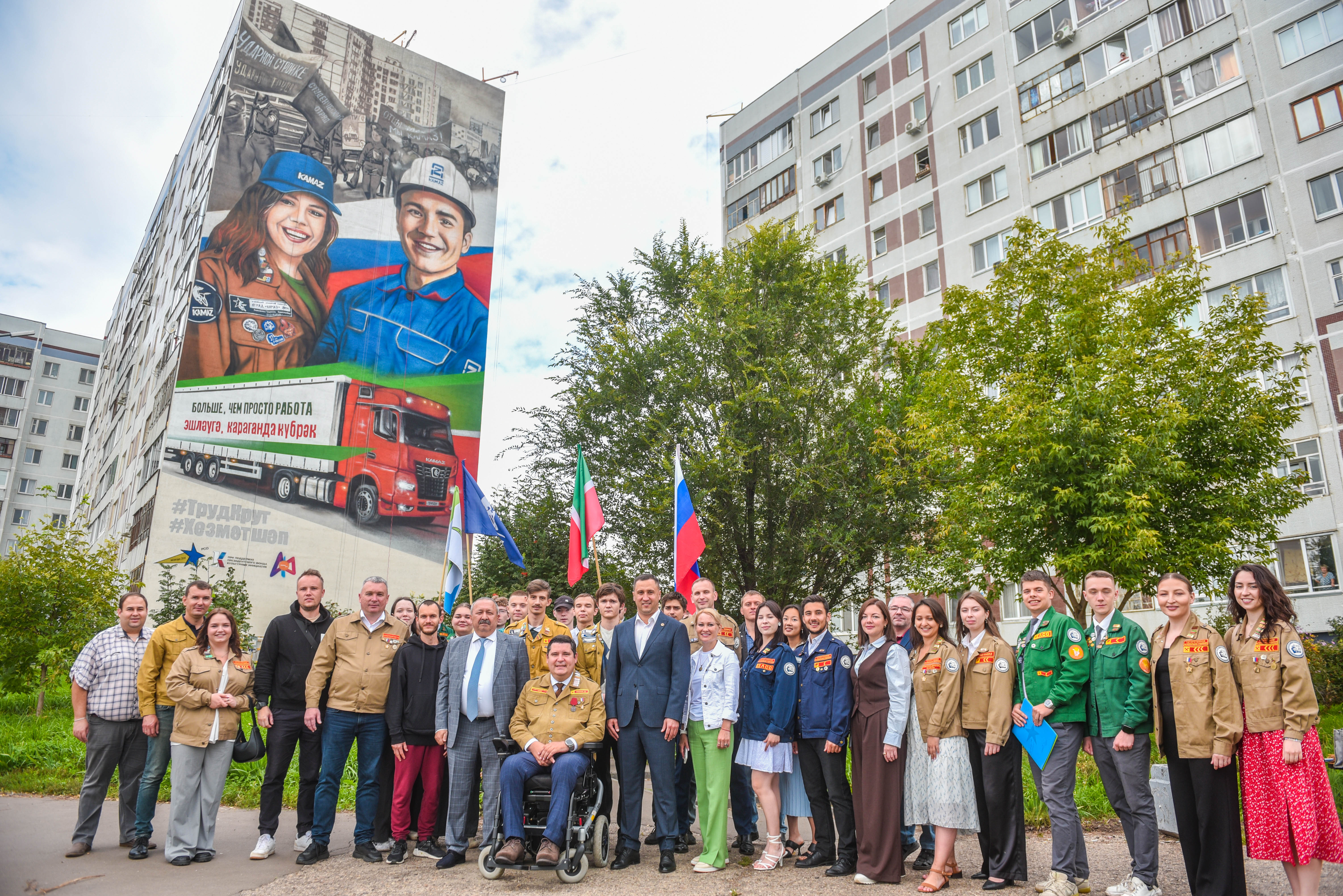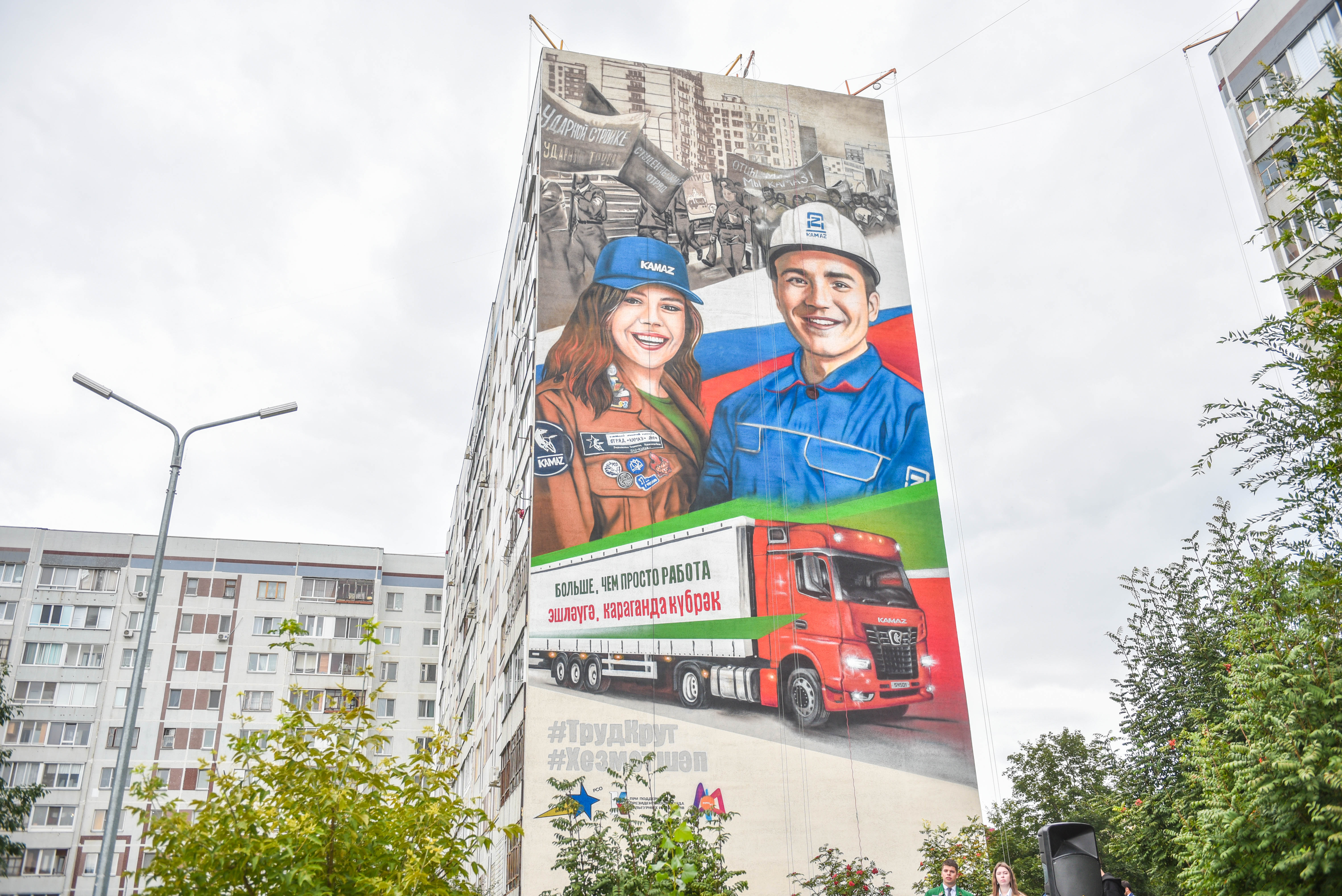 Сегодня на еще одном челнинском доме появился громадный рисунок на стене – на торце дома 32/06 изображен мурал, посвящённый деятельности Всероссийского студенческого производственного отряда «КАМАЗ». В основу идеи эскиза легли два события: 55-летие ПАО «КАМАЗ» и 65-летие молодежной общественной организации «Российские студенческие отряды».