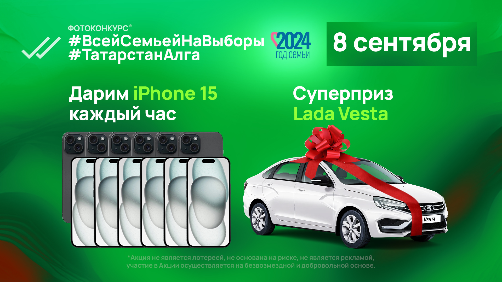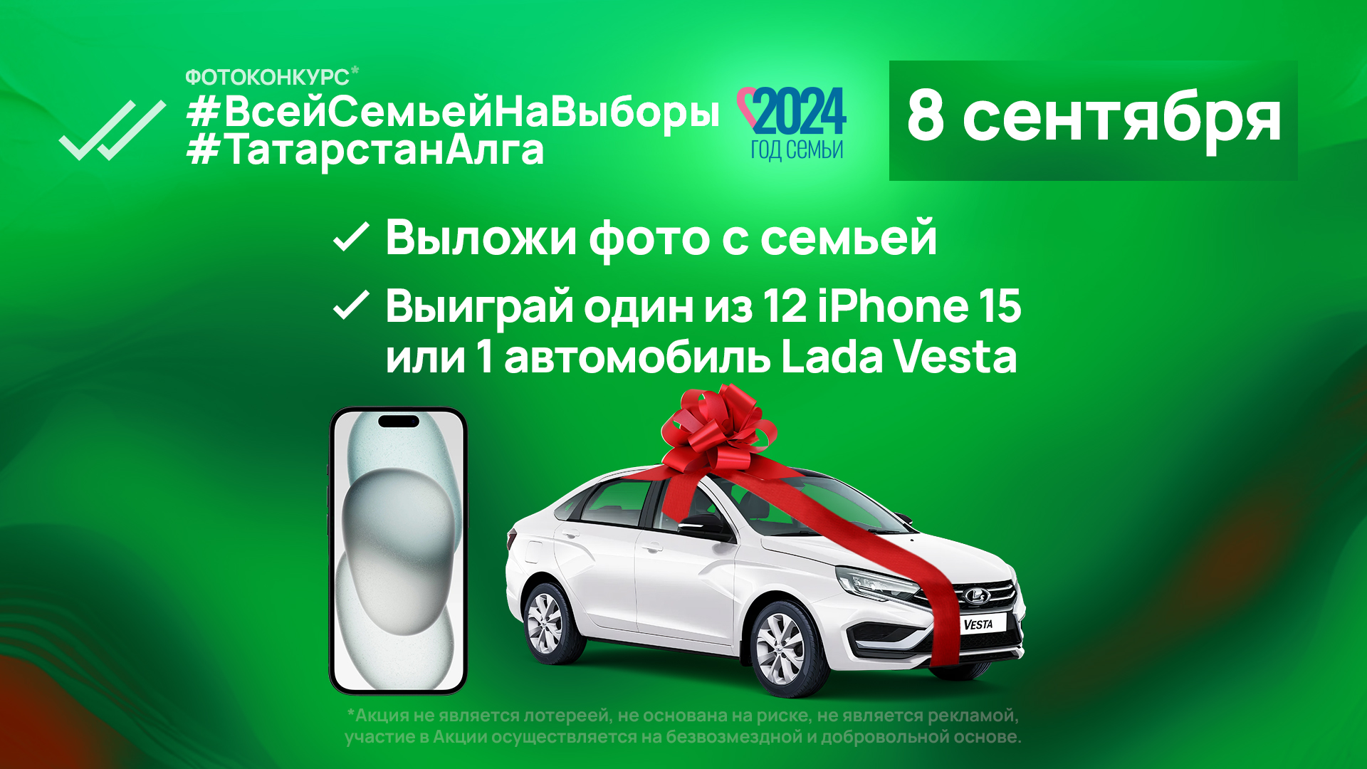 8 сентября состоятся выборы депутатов Государственного Совета Республики Татарстан. В этот день в честь Года семьи стартует республиканский фотоконкурс, который будет проходить в течение дня с 7:00 до 20:00. Принять участие и выиграть один из 12 смартфонов и автомобиль может каждая семья Республики Татарстан.Чтобы принять участие, необходимо: