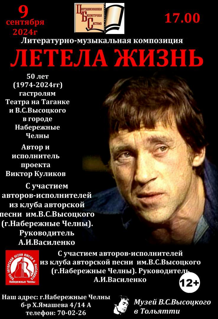 Жители города смогут узнать интересные факты из жизни барда, посмотреть архивные видеокадры и послушать песни Владимира Высоцкого и посвящения его светлой памяти. В программе принимают участие члены клуба авторской песни имени Владимира Высоцкого города Набережные Челны (руководитель – Александр Василенко).