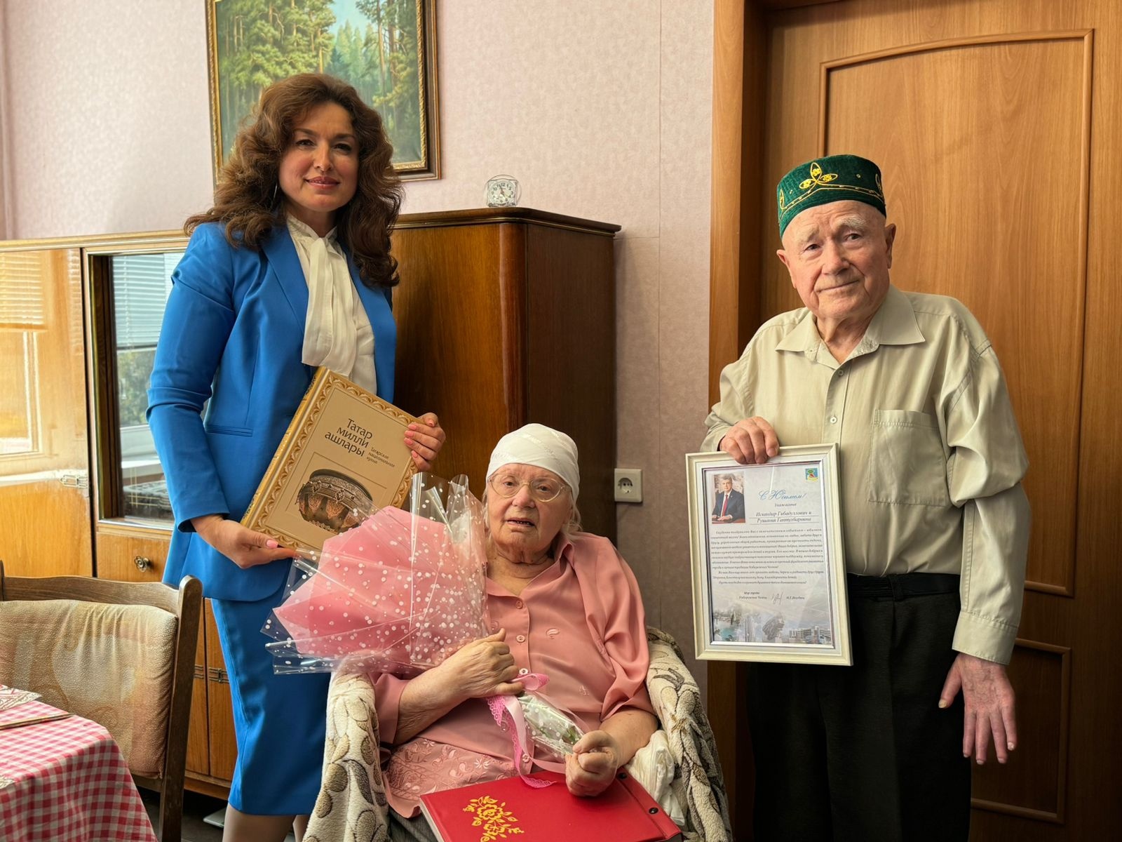 Начальник управления ЗАГС Равиля Зарипова вручила супругам благодарственное письмо от мэра города Наиля Магдеева.