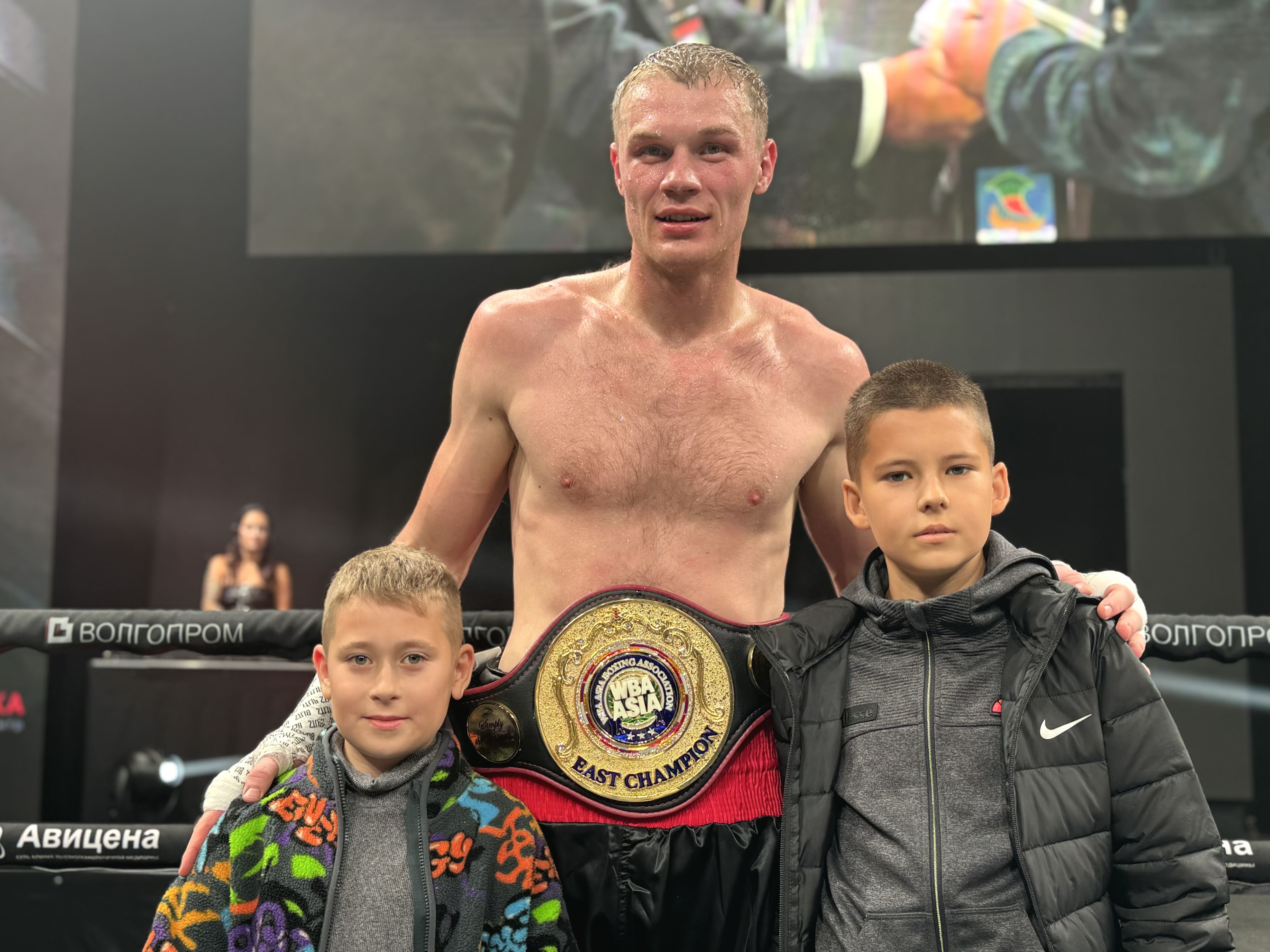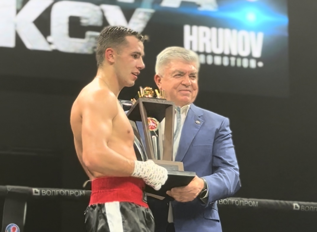Мэр города Наиль Магдеев и генеральный директор «Волгопром» Олег Николаев вручили воспитаннику спортивной школы «Олимпийский» пояс WBA ASIA в первом тяжёлом весе.
