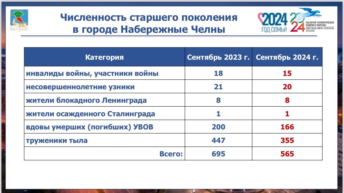 Сейчас в Набережных Челнах проживают 19 граждан, достигших 100 лет и 565 ветеранов Великой Отечественной войны. Самая старшая из граждан "золотого" возраста – Василиса Григорьевна Шахматова, проживающая в Комсомольском районе, ей 106 лет. Среди мужчин – Иван Николаевич Канадиев, ему 103 года и он проживает в Автозаводском районе.