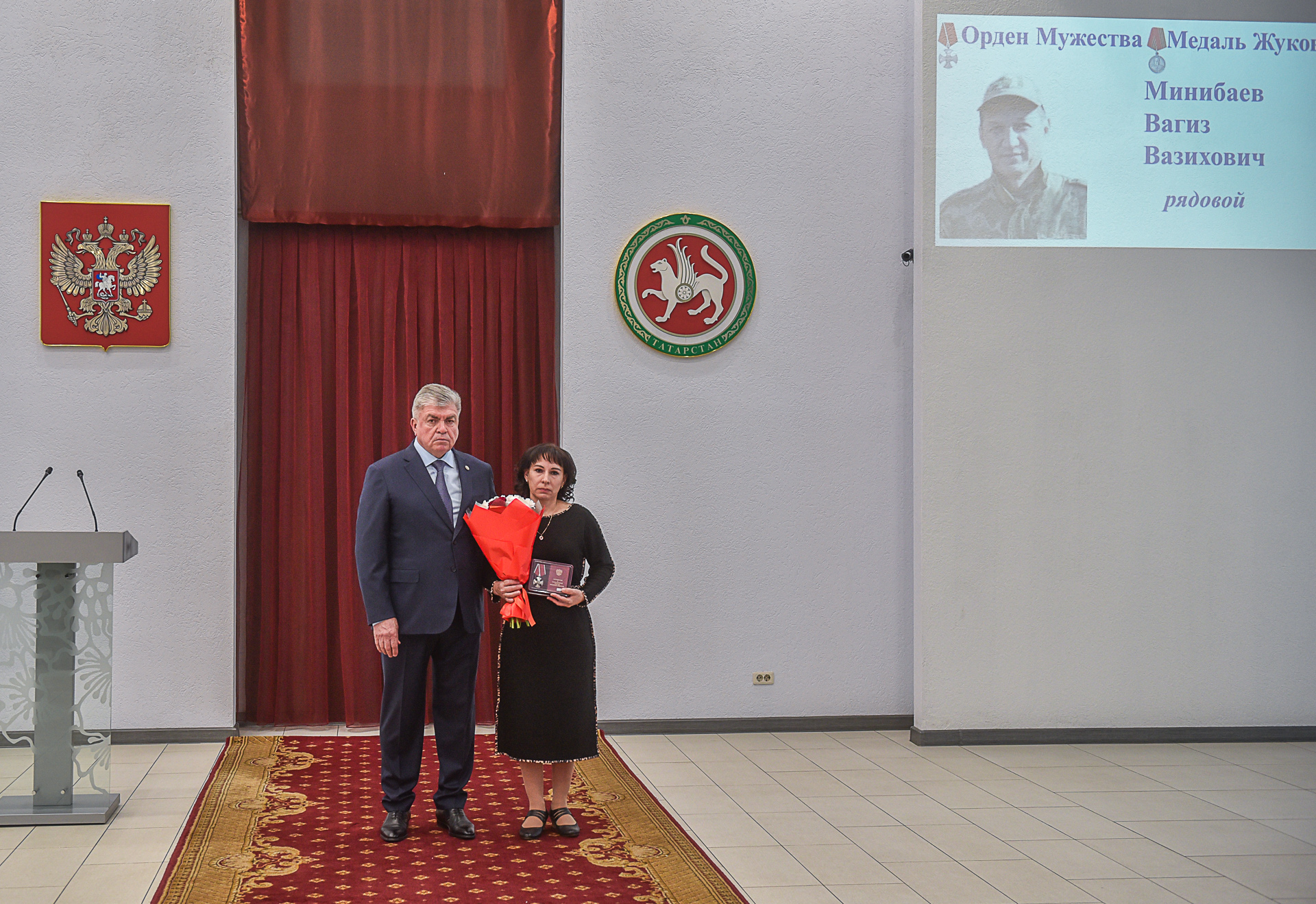 Сегодня в Набережных Челнах мэр города Наиль Магдеев передал государственные награды за мужество, отвагу и самоотверженность, проявленные при исполнении воинского и служебного долга.Указом Президента Российской Федерации посмертно орденом Мужества награждены старший лейтенант Газинур Бурганов, сержанты: Александр Сечин, Фанис Султанов; младший сержант Айрат Хуснутдинов; ефрейторы: Рустем Галиуллин, Ильнар Мурзаханов; рядовые: Тимерлан Альжанов, Алексей Баранов, Рустем Гаймалетдинов, Кирилл Гоголкин, Алексей Ефимов, Рафис Имамутдинов, Дмитрий Корженко, Сергей Майоров, Айрат Мулахметов, Игорь Павлухин, Геннадий Садыков, Александр Сенчук, Андрей Черезов, Динар Шарафутдинов.Орденом Мужества и медалью Жукова посмертно награжден рядовой Вагиз Минибаевмедалью «За отвагу» посмертно награжден рядовой Рустем Камалиев. «Вы можете гордиться своими родными и близкими, которые отдали самое дорогое, что есть у каждого человека – свою жизнь. Они – настоящие герои, которые с оружием в руках отстояли честь и независимость нашей страны. Слушая гимн нашей страны, я поймал себя на мысли, что они делают всё, чтобы мы, граждане Российской Федерации, могли всегда и во все времена слышать свой гимн.Нет ни в одном языке мира тех слов, которые могли бы утешить ваше горе. Уверяю вас, жизнь продолжается, нужно дальше растить детей, внуков. Знайте, мы чтим память наших героев, их имена навечно внесены в историю Набережных Челнов. Мы всегда будем рядом с вами, и в этом не должно быть никаких сомнений. Вечная слава нашим воинам, солдатам нашего Отечества», – обратился к родственникам мэр города Наиль Магдеев.