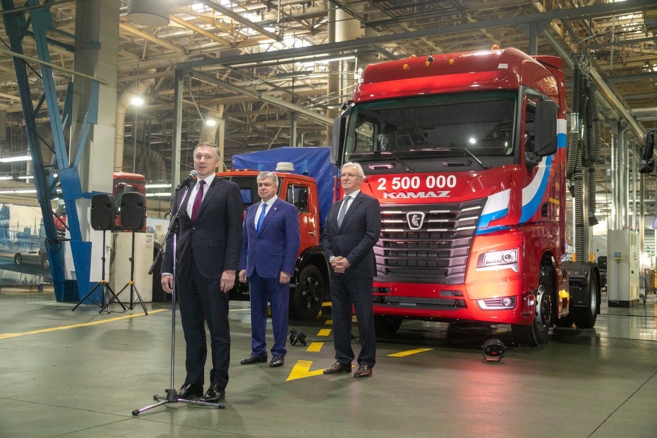 Сегодня, 25 сентября, с главного сборочного конвейера автомобильного завода Набережных Челнов сошел КАМАЗ №2 500 000. Юбилейным грузовиком стал седельный тягач КАМАЗ-54901.В мероприятии приняли участие мэр Наиль Магдеев, заместитель министра промышленности и торговли Российской Федерации Альберт Каримов и генеральный директор ПАО «КАМАЗ» Сергей Когогин.