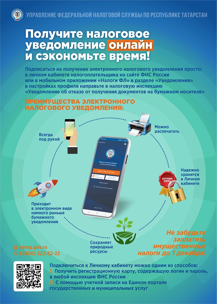Управление Федеральной налоговой службы по Республике Татарстан информирует о возможности получения налогового уведомления онлайн.
