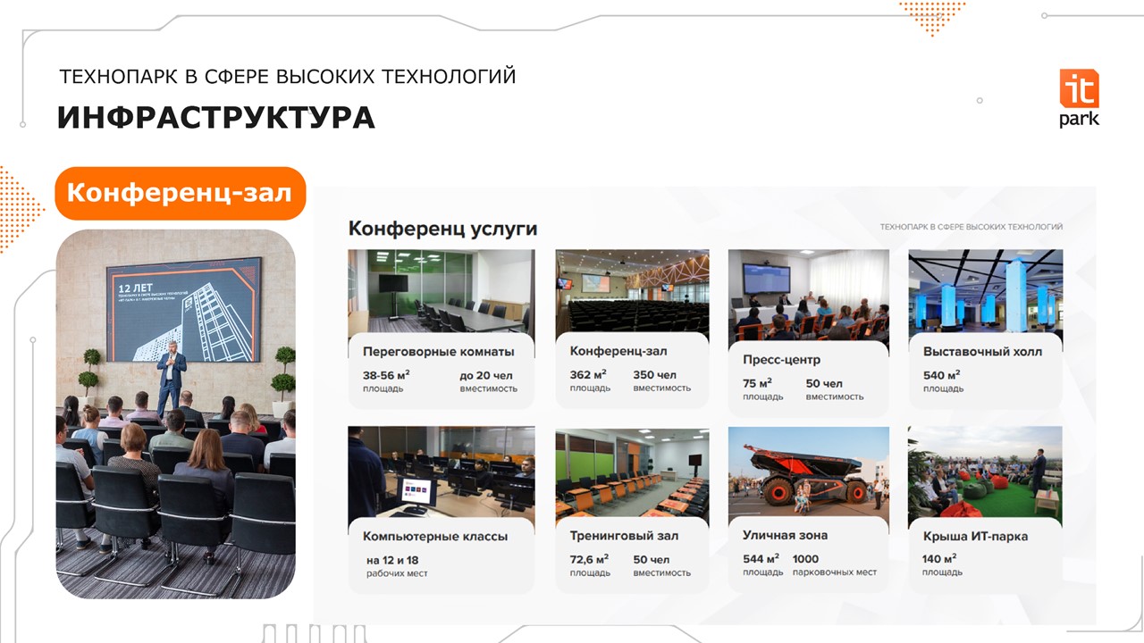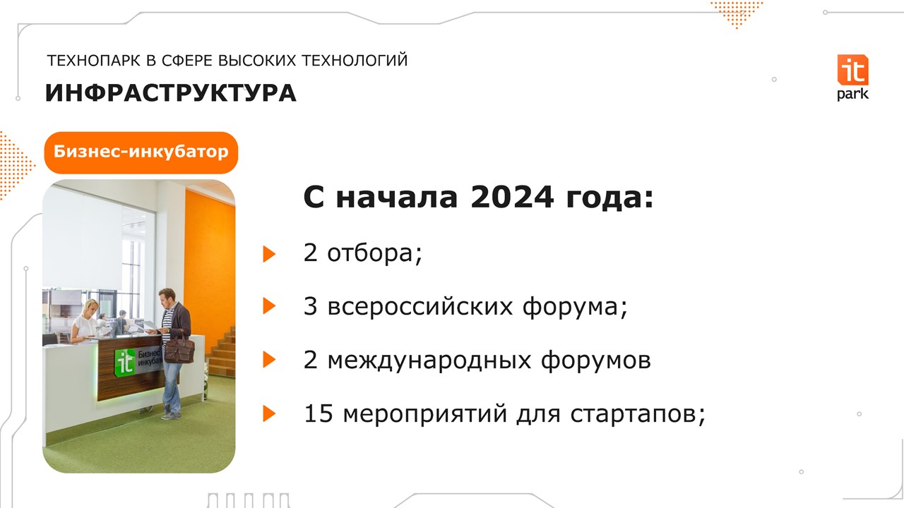 На территории ИТ-парка проходит большое количество крупных мероприятий. Наиболее востребованными темами являются импортозамещение, логистика процессов, автоматизация и цифровизация производств.