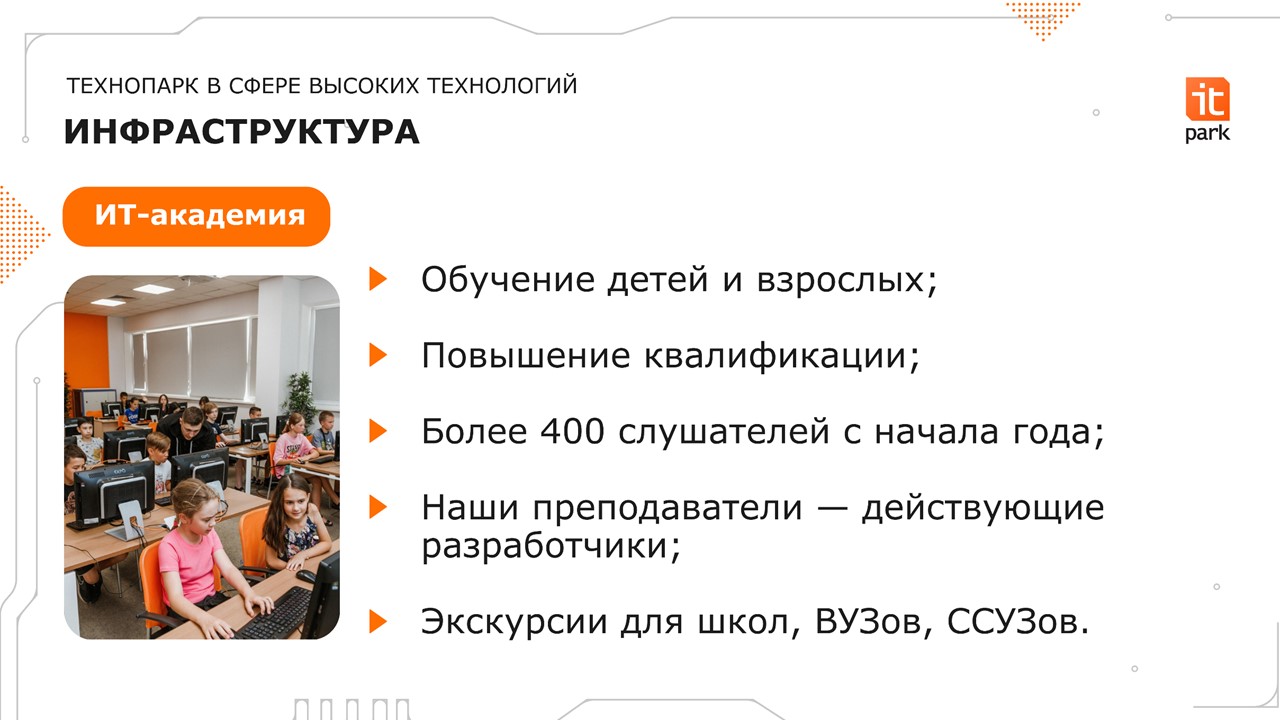 IT-академии технопарка более десяти лет успешно осуществляет свою образовательную деятельность. Обучаться имеют возможность как дети и молодые сотрудники, так и опытные ИТ-специалисты. С начала года обучено более 400 слушателей. В настоящее время программы обучения обновлены в соответствии с современными и актуальными направлениями. Например, востребованными темами сегодня являются возможности нейросети, виртуальной и дополненной реальности.