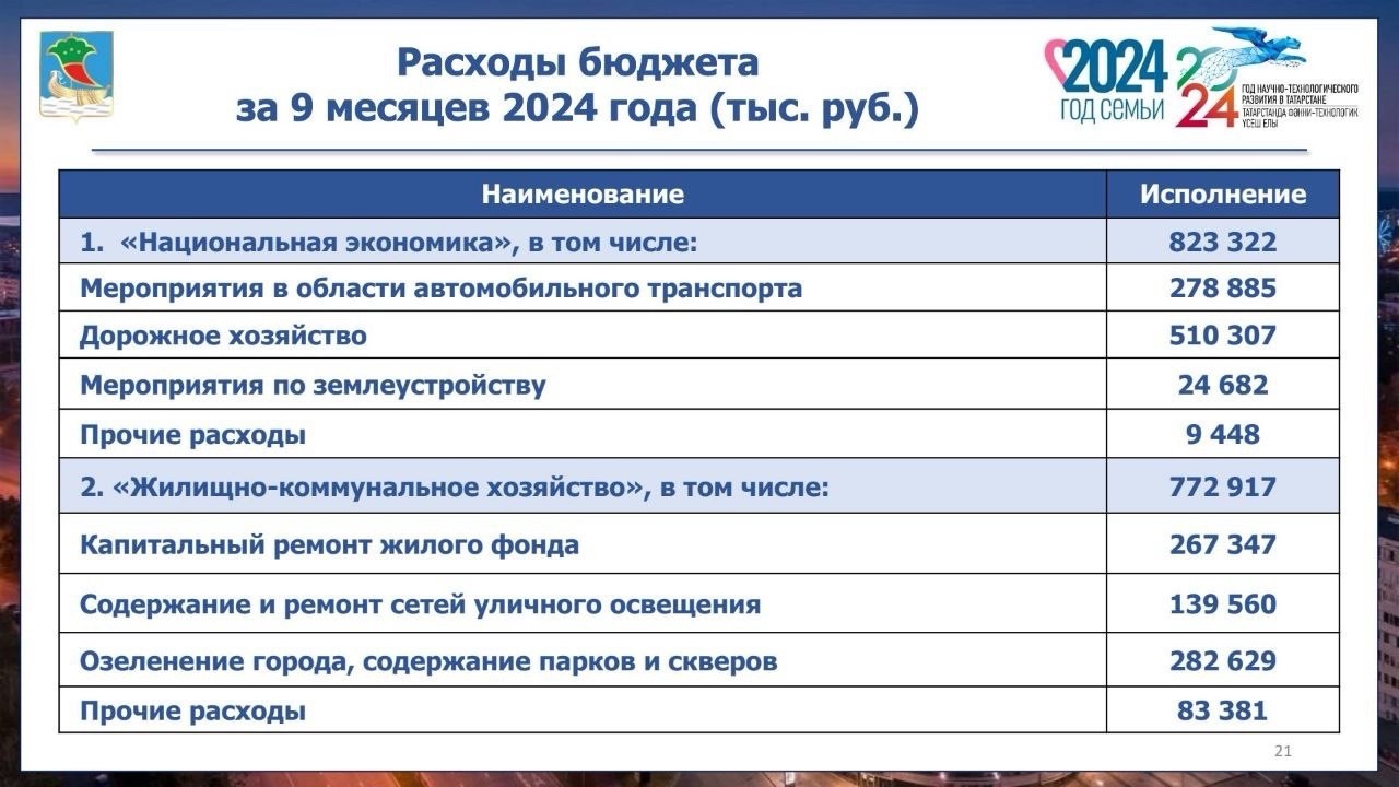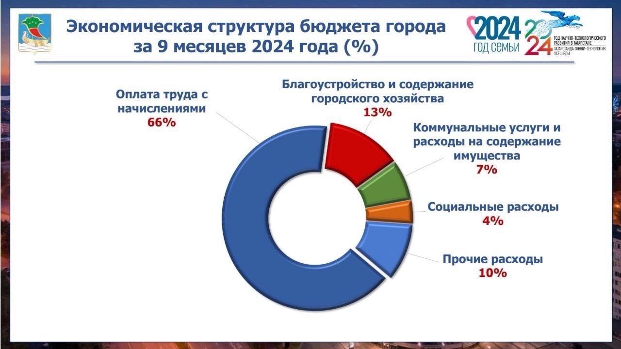 13% расходов приходится на благоустройство и содержание городского хозяйства, 7% – на оплату коммунальных услуг и на содержание имущества муниципальных учреждений, 4% – на социальные расходы и 10% – на прочие расходы (осуществление обязательных платежей, обеспечение материально-технической базы муниципальных учреждений, прочие услуги муниципальных учреждений).