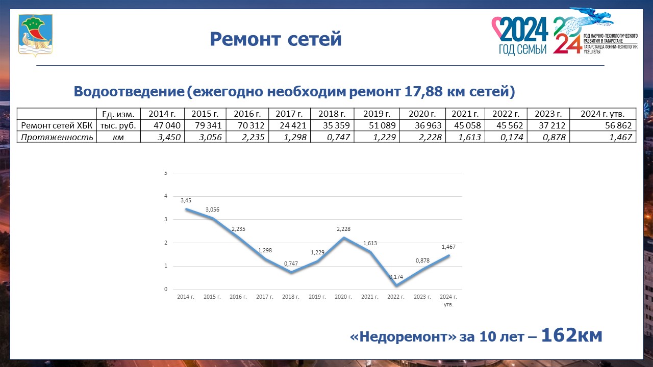 Так, в период с 2014 по 2023 годы произведен ремонт инженерных сетей водоснабжения, однако за этот период «недоремонт» сетей водоотведения составил 162 км. Снижение объемов ремонта инженерных сетей связано с недостаточностью в тарифе денежных средств на ремонт, удорожанием строительных материалов и стоимости работ.