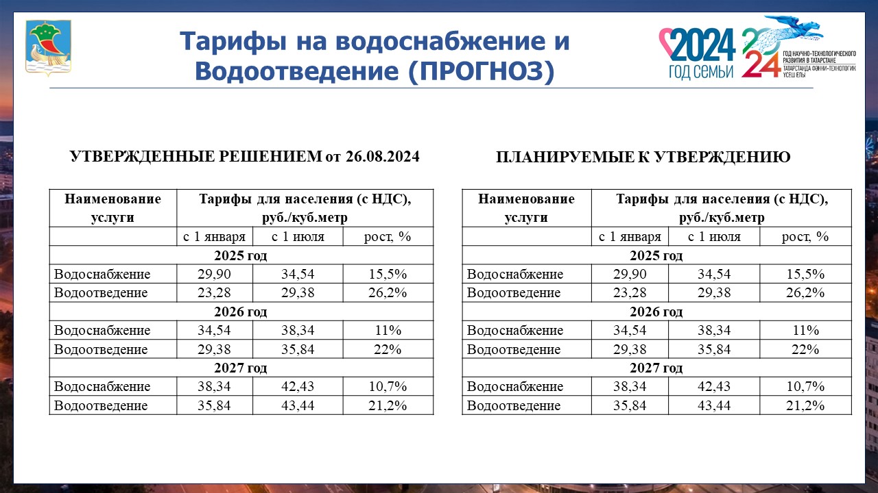 Финансирование программы в рамках тарифов на водоснабжение и водоотведение согласно расчетам, повлек их рост. Прогноз тарифов не изменен.