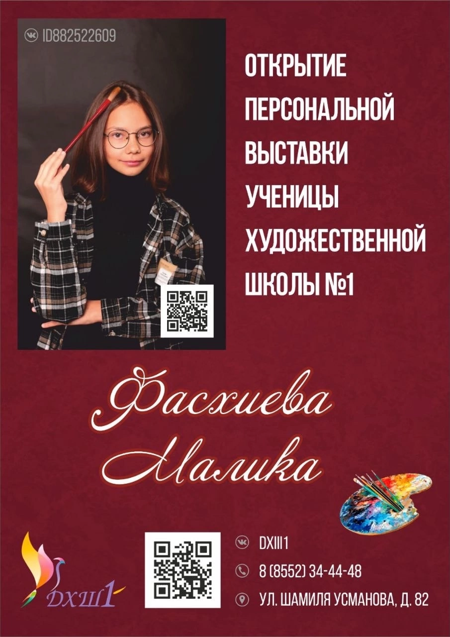 12 ноября в 11:00 в школе №41 состоится торжественное открытие персональной выставки воспитанницы Детской художественной школы №1 Малики Фасхиевой.Малика поощрена дипломом управления культуры Исполнительного комитета «За успехи в учебе и концертно – конкурсной деятельности». Посетители смогут увидеть предметы повседневной жизни и человеческие эмоции, которые превращаются в яркие и живые образы.
