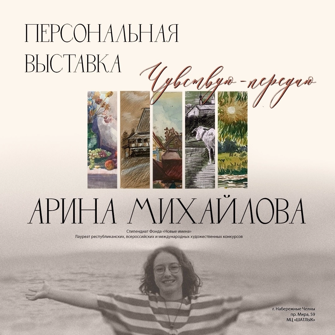 21 ноября в 12:00 в молодёжном центре «Шатлык» состоится открытие персональной выставки Арины Михайловой. Художница является стипендиатом Благотворительного фонда «Новые имена» имени Иветты Вороновой.