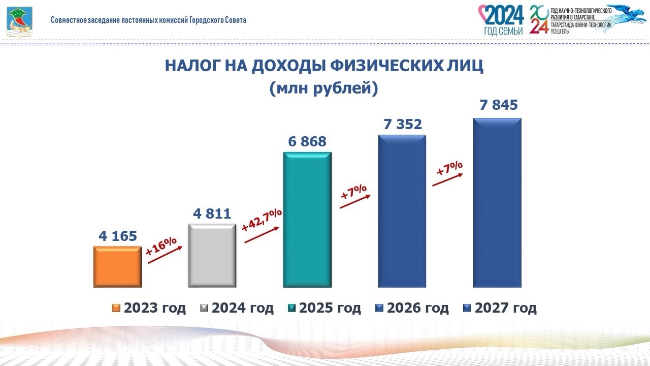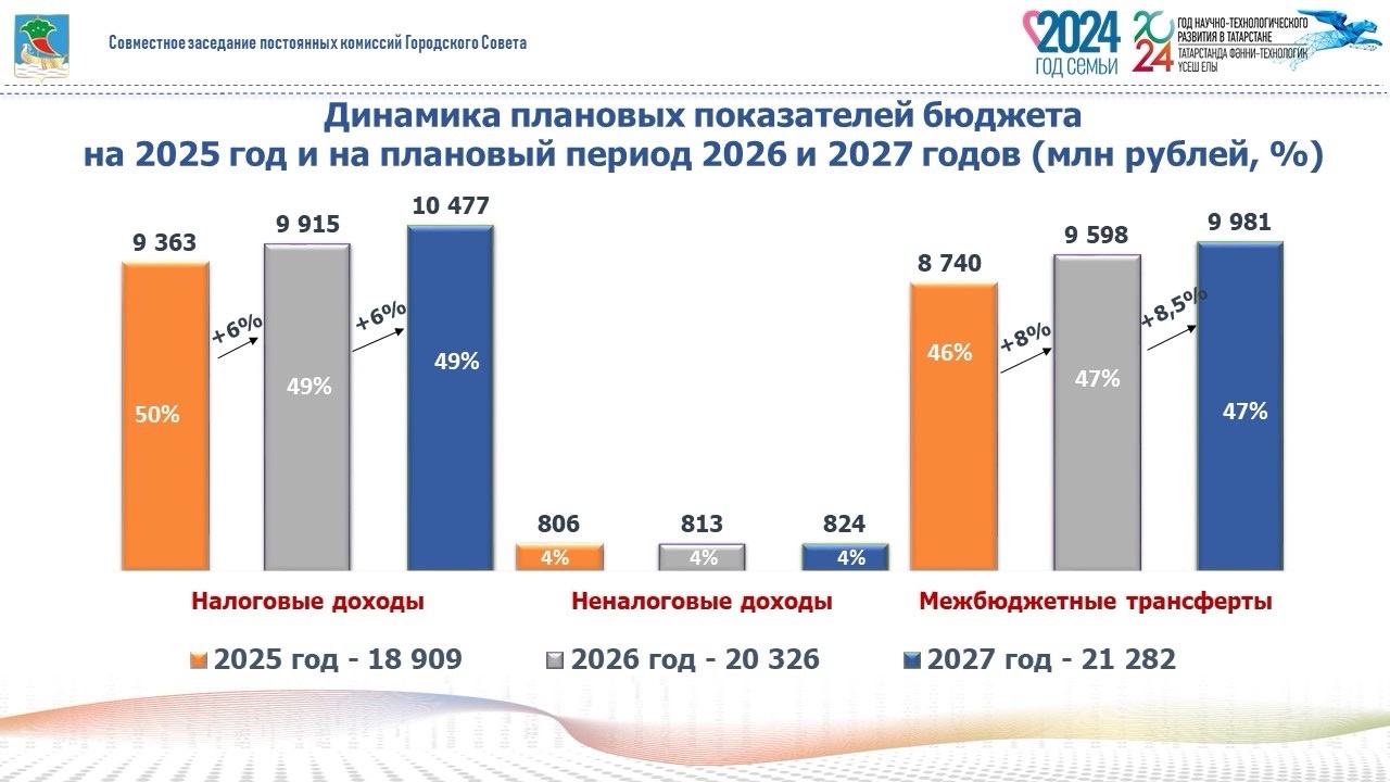 Плановые показатели на 2025 год приняты с ростом на 17,5% к плановым показателям 2024 года и составляют 2 млрд 816 млн рублей в связи: с ростом налога на доходы физических лиц на 42,7%, с учетом применения темпа роста фонда оплаты труда, прогнозируемого Министерством экономики Республики Татарстан на 2025 год на 9,8% и оценки поступлений налога на доходы физических лиц в 2024 году на 32,9%; и также в связи с увеличением налога на совокупный доход на 39,4% по причине увеличения выручки, в результате роста объемов производства, а также роста количества налогоплательщиков, применяющих патентную систему налогообложения.