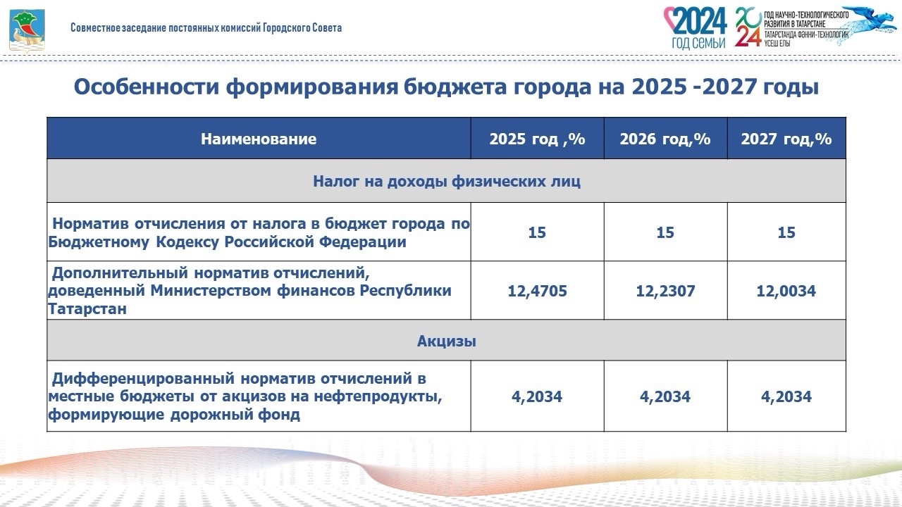 Сумма налога на доходы физических лиц определена с учетом нормативов отчисления от налога в бюджет муниципального образования в размере 15% и дополнительного норматива, доведенного Министерством финансов Республики Татарстан на 2025 год – 12,4705%, на 2026 – 12,2307% и 2027 – 12,0034%.