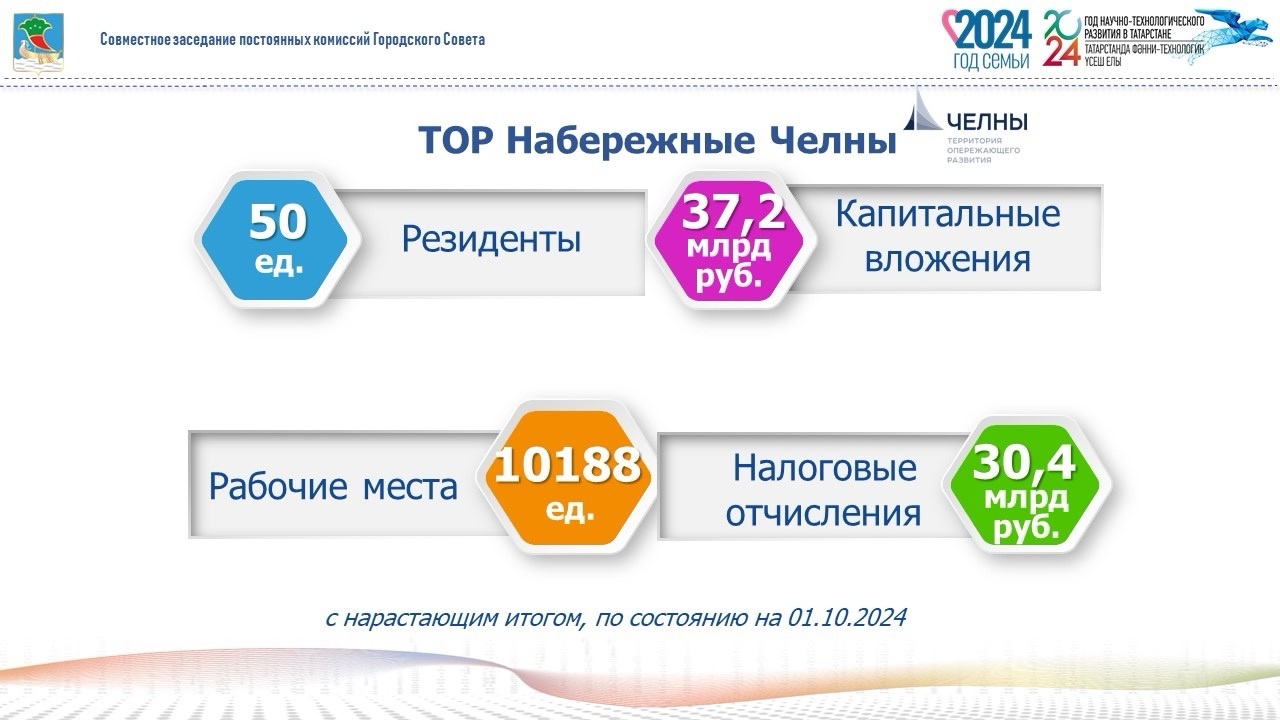 С момента получения городом статуса территории опережающего развития «Набережные Челны» зарегистрировано 50 резидентов ТОР, которыми осуществлено 37 млрд рублей капитальных вложений, инвестировано 46 млрд рублей, а также создано 10 188 рабочих мест.