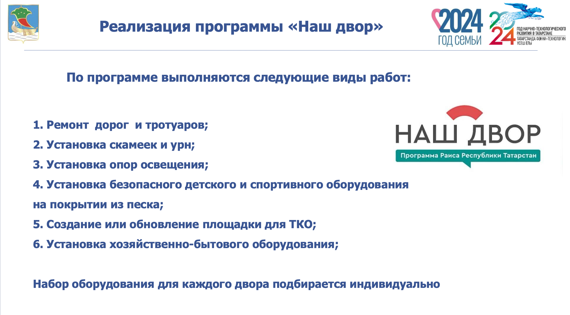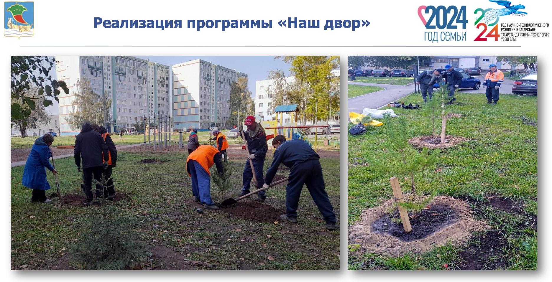 В целом за пять лет реализации программы «Наш двор» в Набережных Челнах благоустроено 493 дворовых территории на сумму 7 916,2 млн рублей. При этом отремонтировано 2 млн кв. м дорог и тротуаров на сумму 6, 379 млн рублей. Полностью заменены сети наружного освещения на сумму 768 млн рублей, на такую же сумму произведен монтаж детского, спортивного и уличного оборудования.