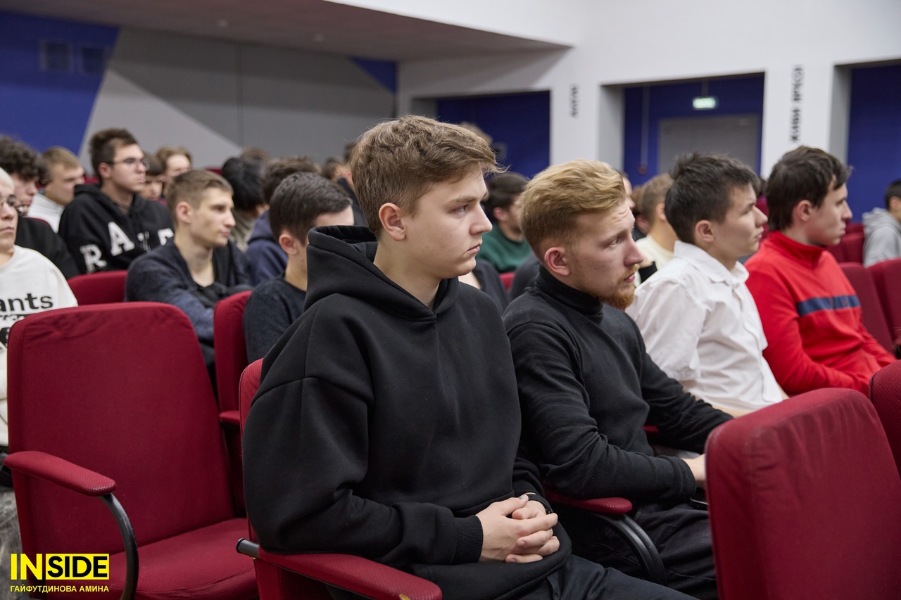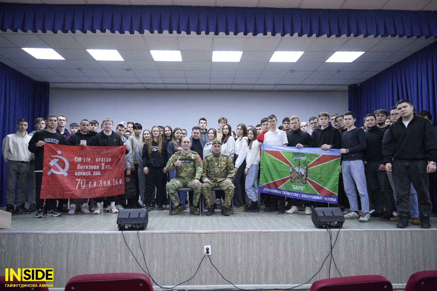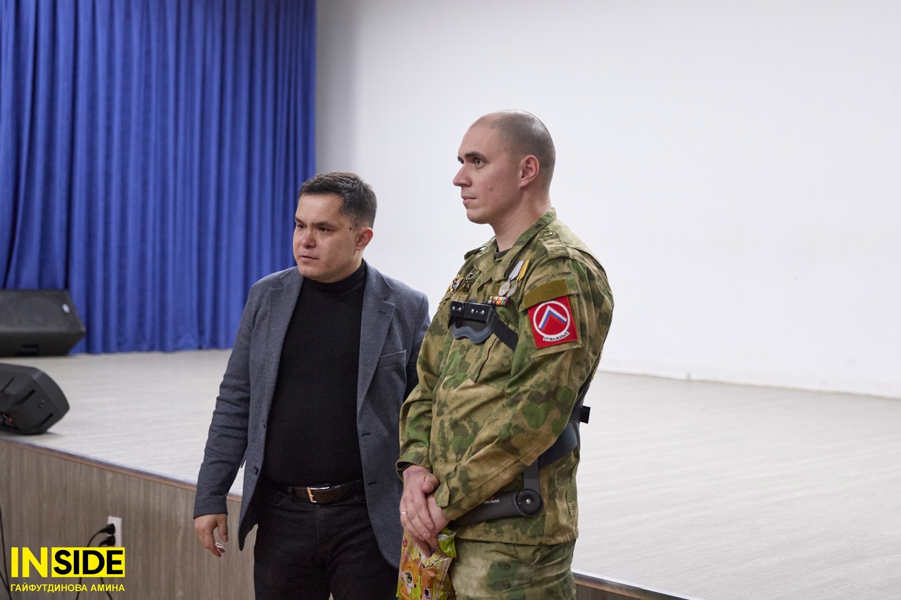 В рамках празднования Дня Героев Отечества студенты НГПУ под руководством доцента кафедры физической культуры и спорта Ирека Гильмутдинова организовали встречу с настоящими героями — участниками специальной военной операции. Своими историями поделились командир огнеметного отделения в отставке Тимур Нусратов и рядовой снайпер-разведчик Владимир Тихомиров.