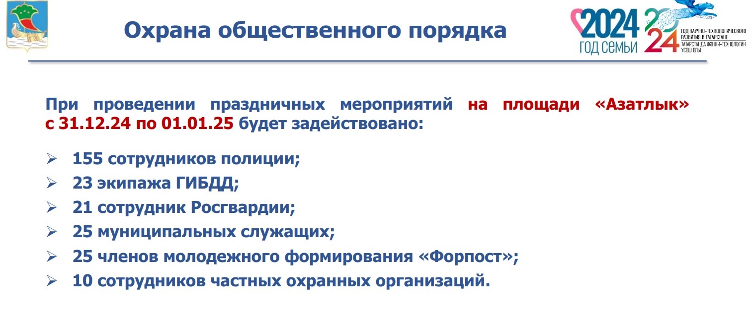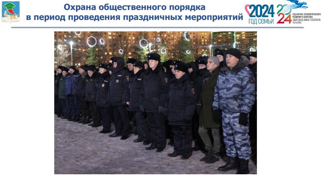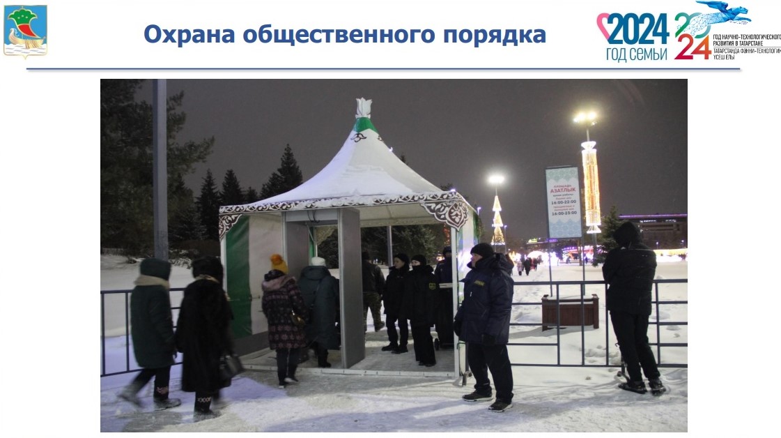 «В настоящее время проводится весь комплекс необходимых подготовительных и организационных мероприятий, связанных с обеспечением охраны общественного порядка. За руководителями Набережночелнинского гарнизона полиции закреплены зоны ответственности по обеспечению правопорядка и общественной безопасности на объектах проведения новогодних мероприятий и иных мест народных гуляний с учетом территориальных особенностей»,  – подчеркнул Раиль Назмиев.