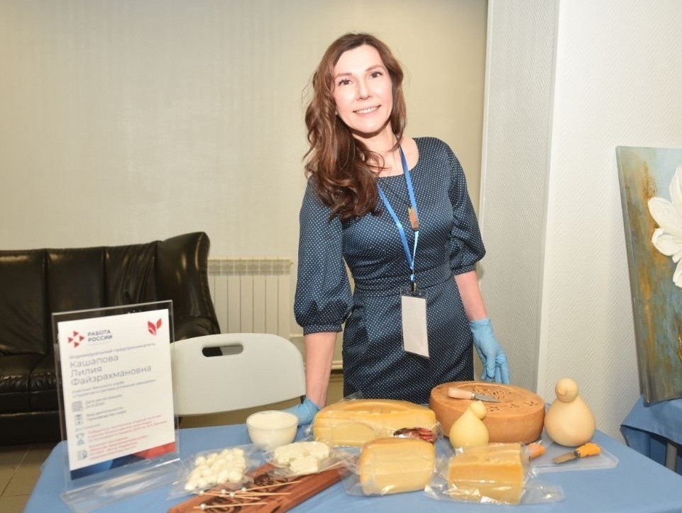 Участники ознакомились с выставкой продукции челнинских предпринимателей, открывших собственное дело через Центр занятости населения. Среди них – мастер-сыродел Лилия Кашапова. С 2020 года она развивает первую в Набережных Челнах мастерскую натурального сыра, где проводит мастер-классы по изготовлению крафтового продукта.