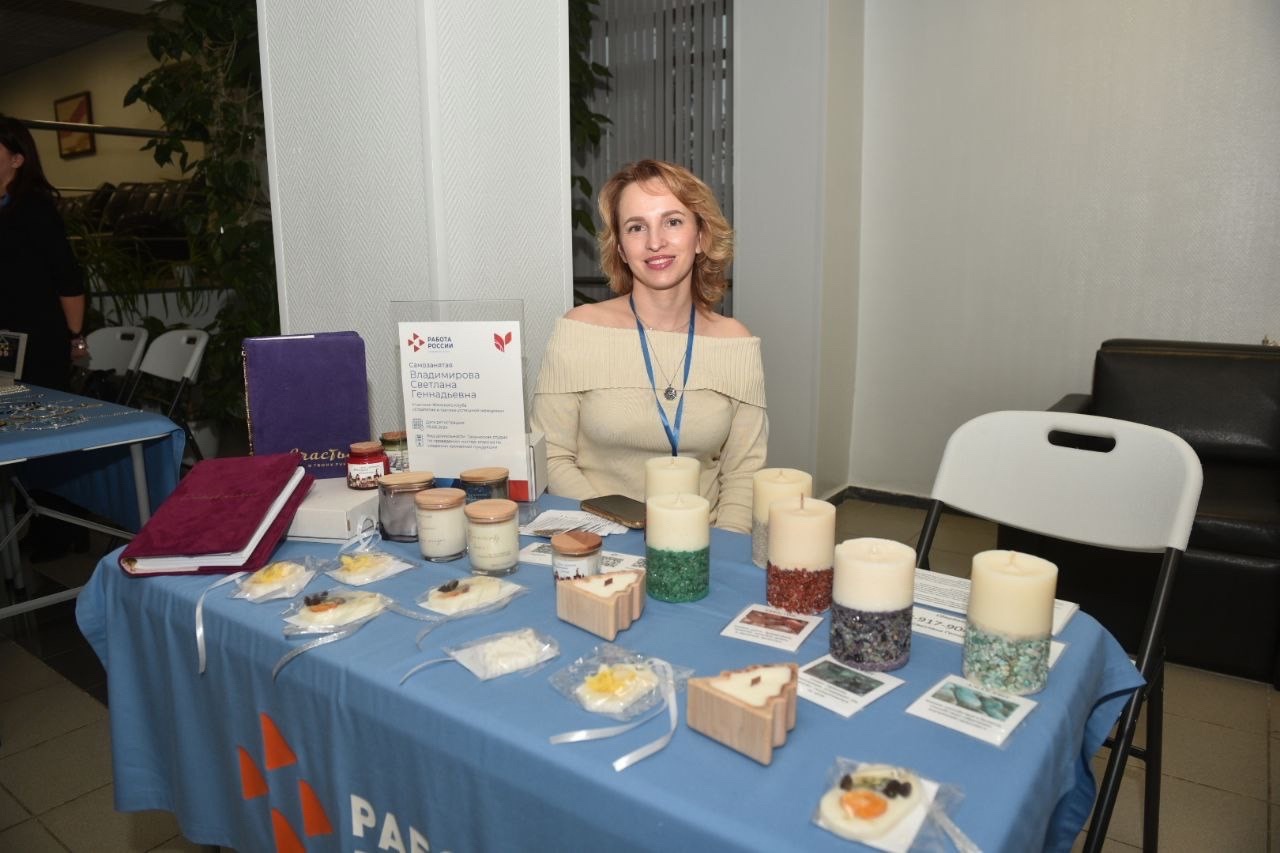 На выставке в кадровом центре «Работа России» Светлана Владимирова представила ароматические свечи, которые изготавливает самостоятельно. Сейчас она проводит мастер-классы по их созданию.