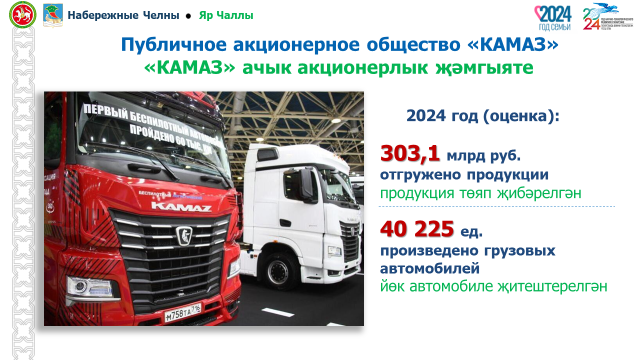 По итогам года компания планирует произвести более 40 тысяч грузовых автомобилей. КАМАЗ продолжает работу по развитию модельного ряда грузовой и пассажирской техники, динамично развивает инновации, укрепляя технологический суверенитет нашей страны. В целом, итоги работы КАМАЗа соответствуют показателям бизнес-плана компании на 2024 год", – произнес мэр Наиль Магдеев.
