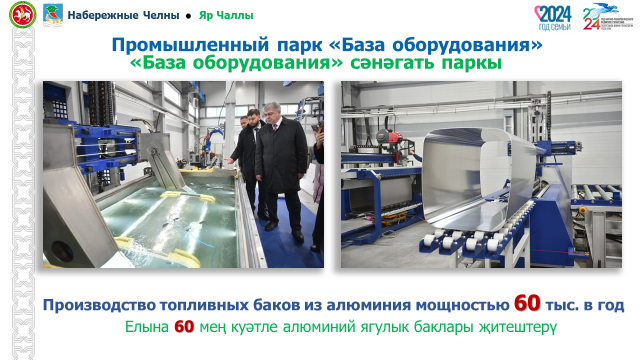 «Современные производства открываются и в частных парках. Так, в парке «База оборудования» открылось самое современное производство топливных баков из алюминия, максимальной мощностью 60 тыс. единиц в год. У производства есть все шансы занять новые ниши на отечественном рынке», – рассказал мэр Наиль Магдеев. В появлении новой промышленной площадки мэр отметил поддержку Рустама Минниханова.