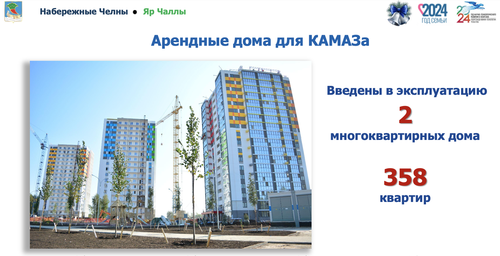 Отдельный блок в выступлении мэр города Наиль Магдеев посвятил строительной отрасли. Так, сегодня введено 253 тыс. кв. м жилья. Годовой план по вводу жилья безусловно будет выполнен.В рамках решения задачи по привлечению специалистов на КАМАЗ и промышленные предприятия города принято решение о строительстве шести арендных домов, из которых два введены в эксплуатацию.