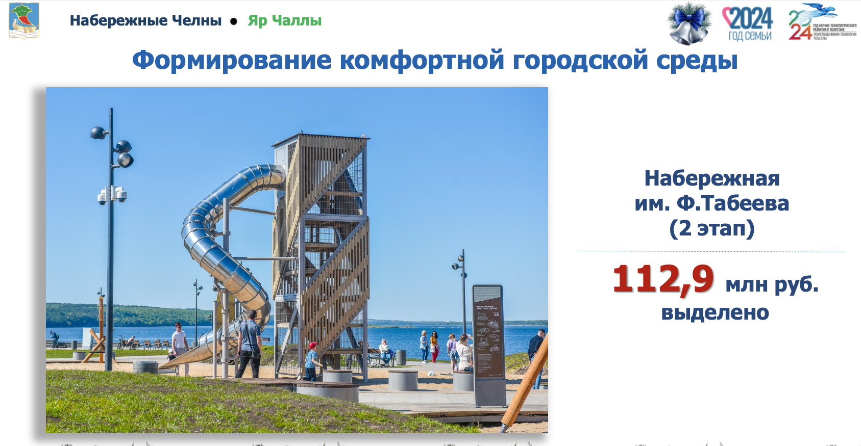 «С каждым годом челнинские дворы преображаются и становятся более комфортными для жителей. Этому способствует программа «Наш двор».В текущем году благоустроен 71 двор на общую сумму 1 млрд 700 млн руб. В шаговой доступности от домов появились современные, разнообразные детские и спортивные площадки, что конечно положительно повлияло на жизнь наших горожан», – подчеркнул Наиль Магдеев.