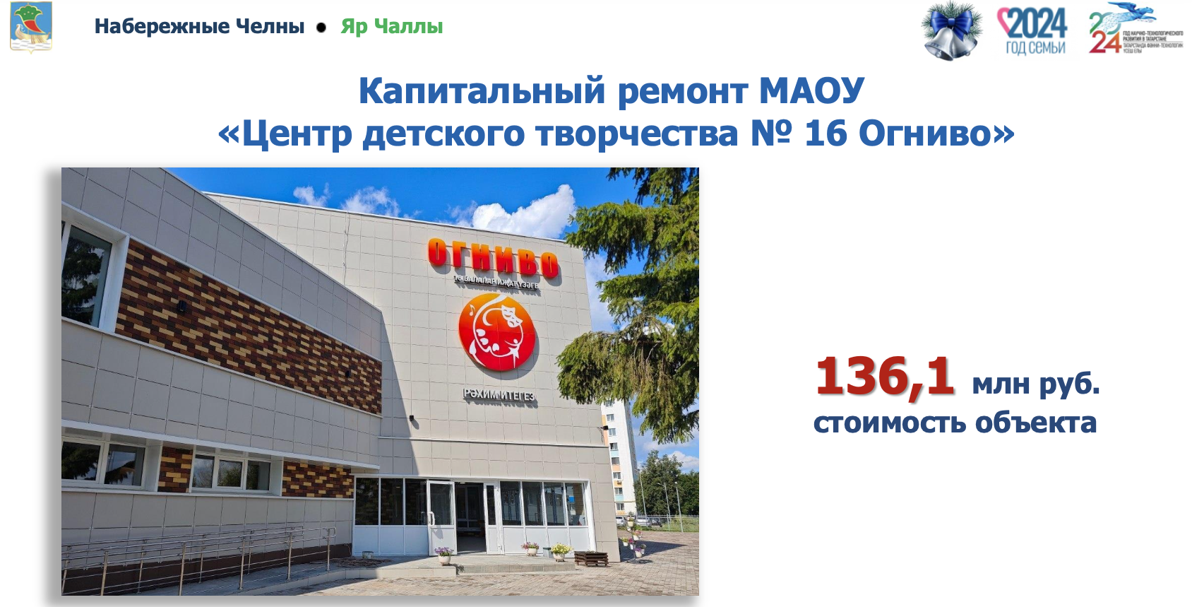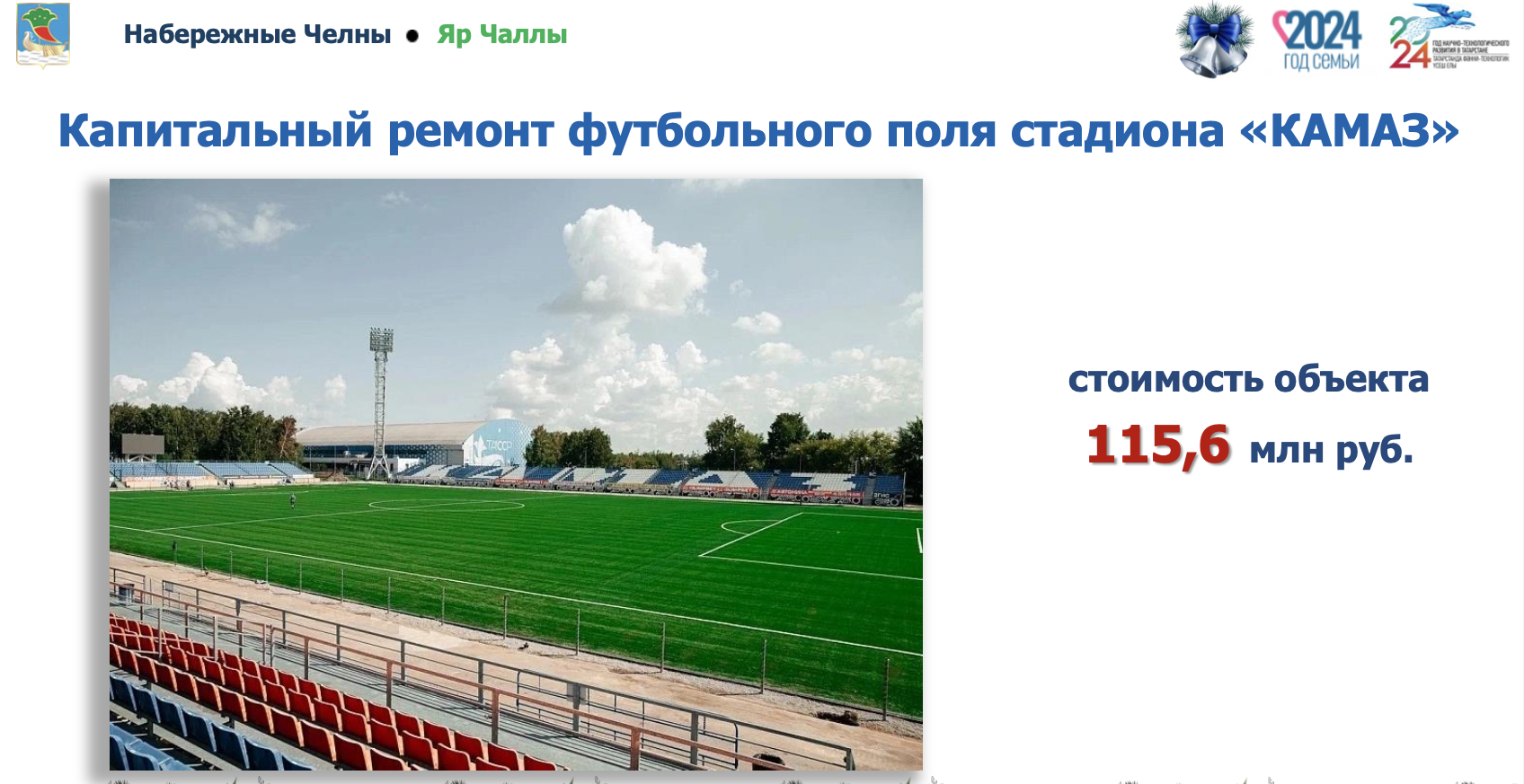 Обновляются и объекты спорта. «Спортивный комплекс «Олимпийский» – одна из основных школ по подготовке спортсменов, команд города и республики. Долгие годы челнинцы ждали капитального ремонта этого объекта. Он был построен 44 года назад», – сказал мэр города. Также проведены работы по замене покрытия футбольного поля стадиона «КАМАЗ».