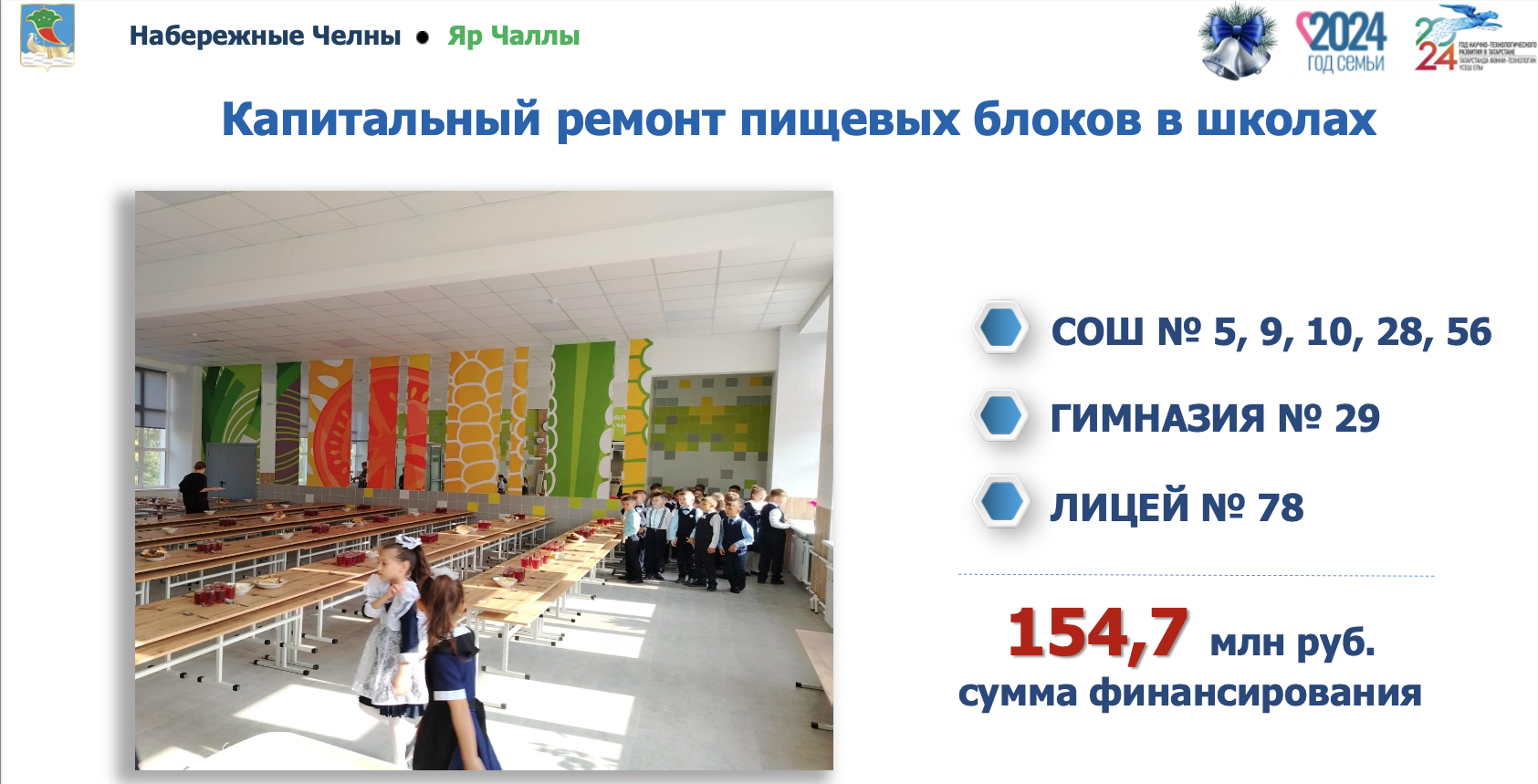 Выполнен капитальный ремонт ряда учебных заведений: Камского автомеханического техникума имени Л.Б. Васильева, лицея-интерната им. Гали Акыша, пищеблоков в семишколах.