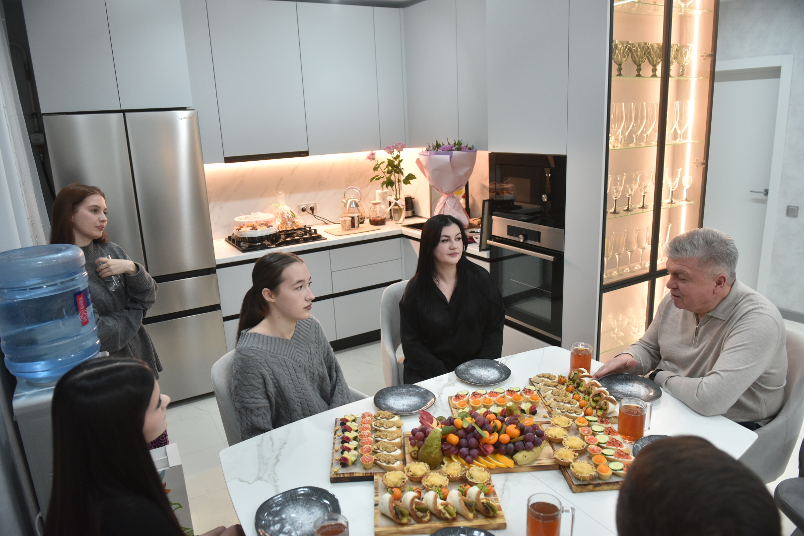 Мэр в разговоре с семьей отметил, что их папа и супруг настоящий герой и они должны гордиться им. Андрей Петрович - подполковник, пенсионер МВД. В октябре 2022 года отправился на фронт, погиб. В декабре во Дворце торжеств вдове передан орден Мужества.